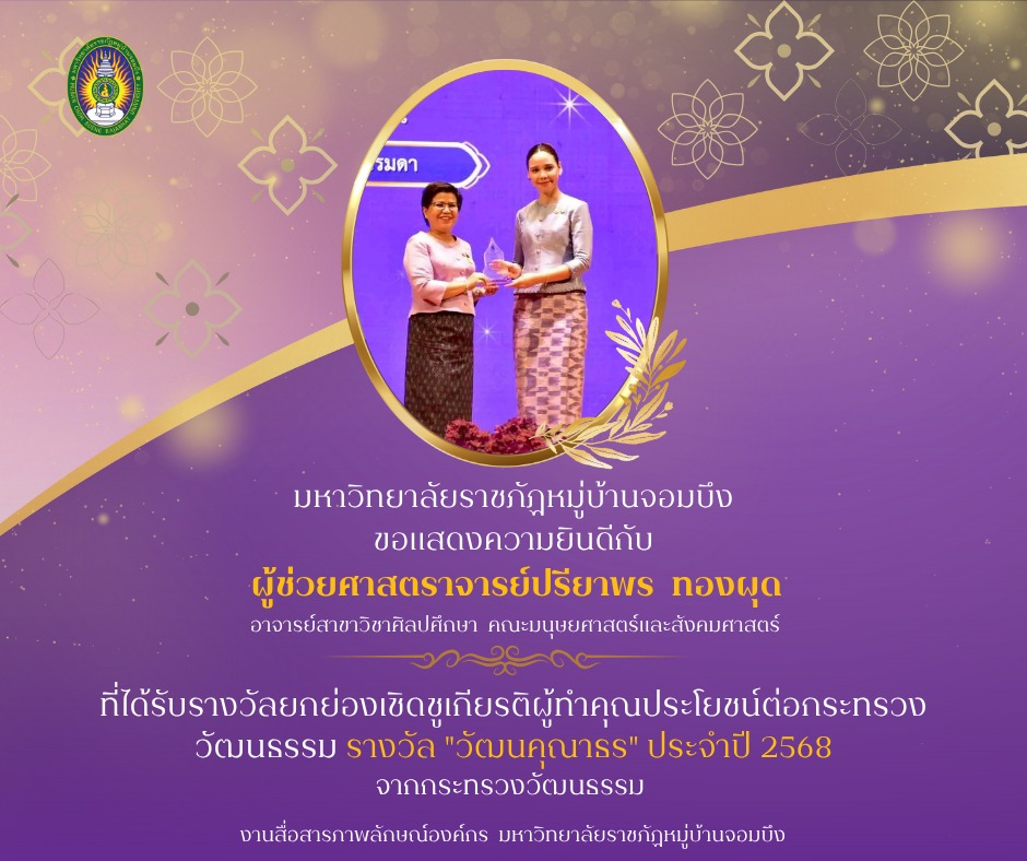 มหาวิทยาลัยราชภัฏหมู่บ้านจอมบึง ขอแสดงความยินดีกับผศ.ปรียาพร ทองผุด ที่ได้รับรางวัลยกย่องเชิดชูเกียรติผู้ทำคุณประโยชน์ด้านศาสนา ศิลปะ และวัฒนธรรม "วัฒนคุณาธร ประจำปี 2568"