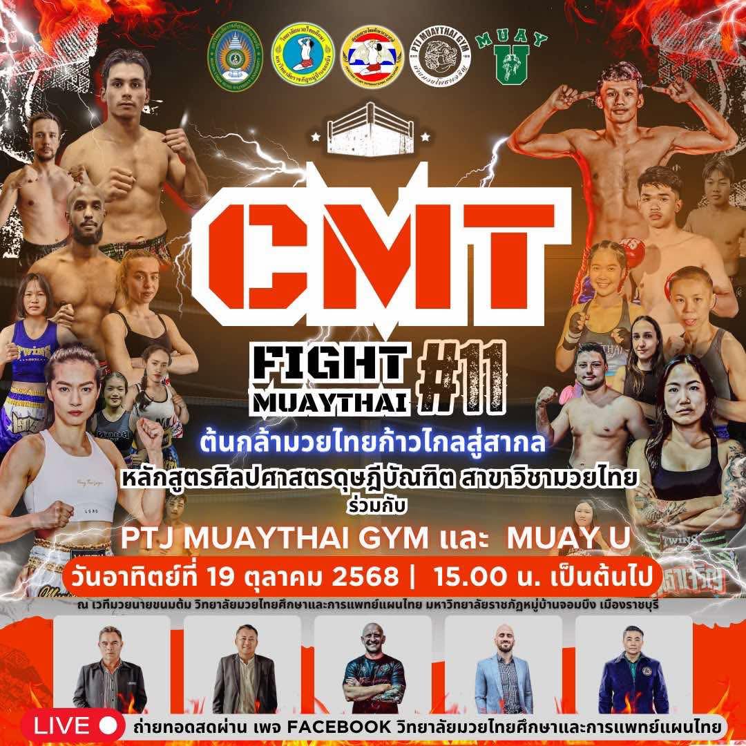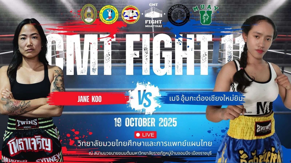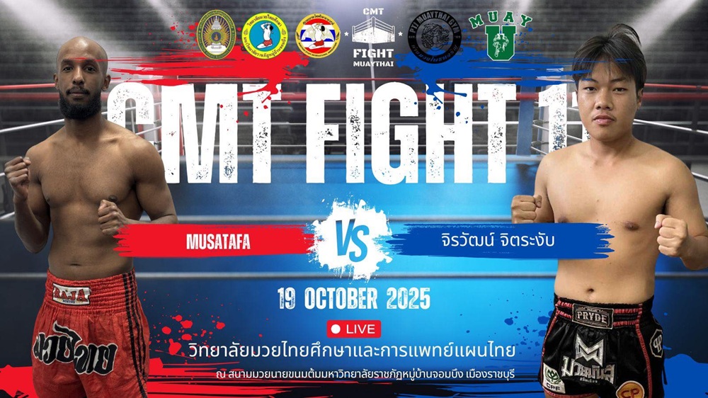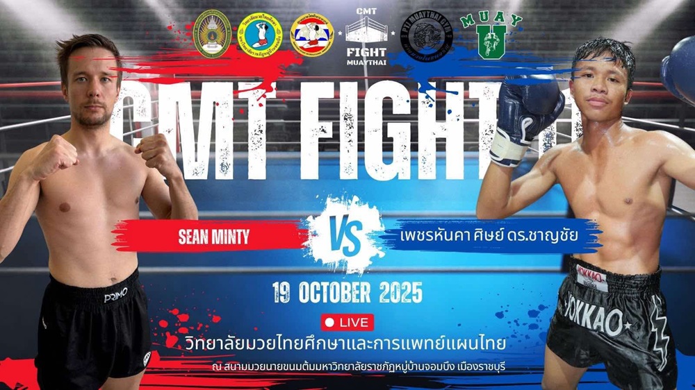 📅 วันเสาร์ที่ 19 ตุลาคม 2568 เวลา 15.00 น. เป็นต้นไป ณ สนามมวยนายขนมต้ม วิทยาลัยมวยไทยศึกษาและการแพทย์แผนไทย มหาวิทยาลัยราชภัฏหมู่บ้านจอมบึง จังหวัดราชบุรี