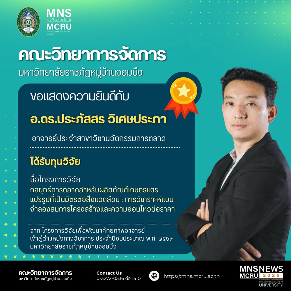 มหาวิทยาลัยขอชื่นชมและเป็นกำลังใจให้กับคณาจารย์ทุกท่าน ในการมุ่งมั่นสร้างสรรค์ผลงานวิจัยที่มีคุณค่า เพื่อนำไปสู่การพัฒนาศักยภาพวิชาการและทำประโยชน์แก่สังคมต่อไป