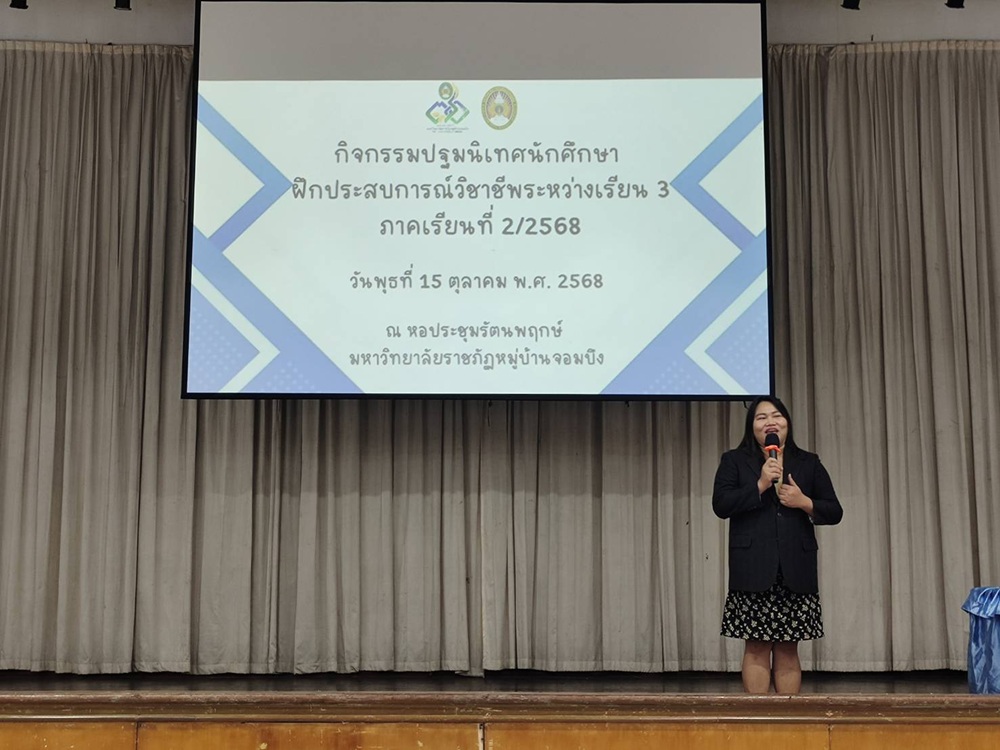 เมื่อวันที่ 15 ตุลาคม 2568 ศูนย์พัฒนาวิชาชีพครู คณะครุศาสตร์ มหาวิทยาลัยราชภัฏหมู่บ้านจอมบึง จัดกิจกรรม “ปฐมนิเทศนักศึกษาฝึกประสบการณ์วิชาชีพระหว่างเรียน 3 ภาคเรียนที่ 2/2568” ณ หอประชุมรัตนพฤกษ์ โดยมี ผู้ช่วยศาสตราจารย์ยุพยงค์ วิงวร คณบดีคณะมนุษยศาสตร์และสังคมศาสตร์ ให้เกียรติเป็นประธานเปิดกิจกรรม พร้อมได้รับเกียรติจาก อาจารย์ ดร.อินธิรา เกื้อเสนาะ และ อาจารย์ ดร.กุลกาญจน์ สุวรรณรักษ์ เป็นวิทยากรบรรยาย ถ่ายทอดความรู้และประสบการณ์ เพื่อสร้างความเข้าใจให้แก่นักศึกษาก่อนออกฝึกประสบการณ์วิชาชีพ