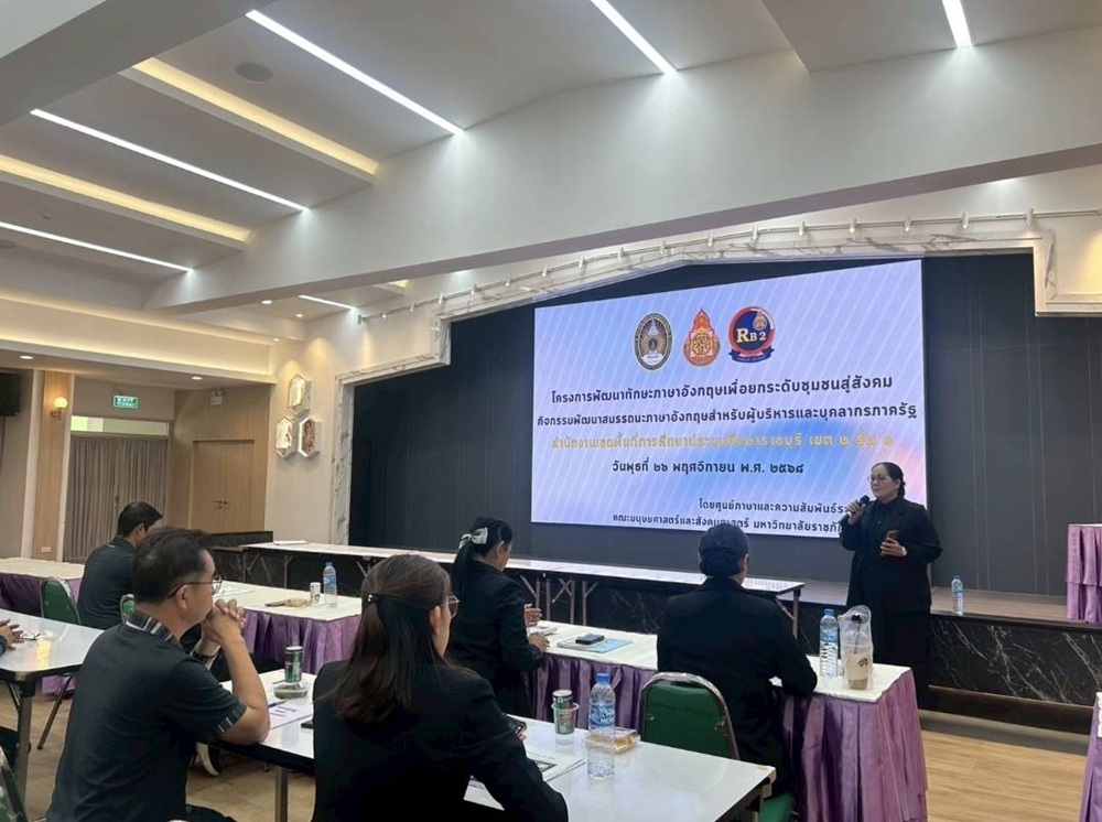 วันพุธที่ 26 พฤศจิกายน 2568 ผู้ช่วยศาสตราจารย์ ยุพยงค์ วิงวร คณบดีคณะมนุษยศาสตร์และสังคมศาสตร์ มหาวิทยาลัยราชภัฏหมู่บ้านจอมบึง เป็นประธานในพิธีเปิดโครงการ “พัฒนาทักษะภาษาอังกฤษเพื่อยกระดับชุมชนสู่สังคม” (กิจกรรมพัฒนาสมรรถนะภาษาอังกฤษสำหรับผู้บริหารและบุคลากรภาครัฐ) ณ ห้องประชุมสุพจน์ มิเถาวัลย์ ชั้น 2 อาคารอำนวยการ มหาวิทยาลัยราชภัฏหมู่บ้านจอมบึง