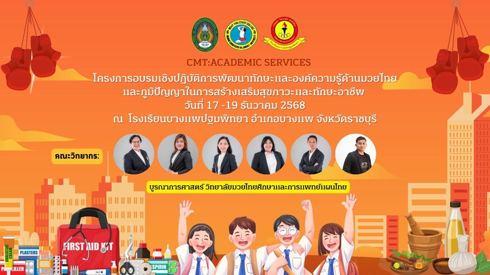 วิทยาลัยมวยไทยศึกษาและการแพทย์แผนไทย มหาวิทยาลัยราชภัฏหมู่บ้านจอมบึง ลงพื้นที่จัดกิจกรรม โครงการอบรมเชิงปฏิบัติการพัฒนาทักษะและองค์ความรู้ด้านมวยไทยและภูมิปัญญาในการสร้างเสริมสุขภาวะและทักษะอาชีพ ภายใต้โครงการ “ต้นกล้ามวยไทยสร้างสุข ยกระดับชุมชนปั้น Soft Power ไทยสู่สากล” ระหว่างวันที่ 17–19 ธันวาคม 2568 ณ โรงเรียนบางแพปฐมพิทยา อำเภอบางแพ จังหวัดราชบุรี