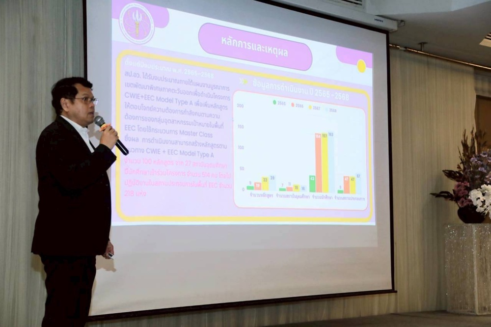 วันที่ 23 ธันวาคม 2568 ผู้ช่วยศาสตราจารย์ ดร.รพีพรรณ กองตูม รองอธิการบดี พร้อมด้วย ผู้ช่วยศาสตราจารย์ ว่าที่ร้อยตรี ดร.วสันต์ นาคเสนีย์ และ ผู้ช่วยศาสตราจารย์ ดร.สุเมธ ลิปิโรจนพงศ์ ผู้แทนหลักสูตรที่ได้รับการสนับสนุนงบประมาณ โครงการ CWIE + EEC Model Type A Master Class ประจำปีงบประมาณ พ.ศ. 2566 เป็นผู้แทนมหาวิทยาลัยราชภัฏหมู่บ้านจอมบึง เข้าร่วมการประชุมเชิงปฏิบัติการเพื่อสร้างความรู้ความเข้าใจและส่งเสริมการมีส่วนร่วมในการขับเคลื่อน โครงการเร่งรัดและขยายผลการผลิตกำลังคนสมรรถนะสูง โดยใช้แนวทาง สหกิจศึกษาและการศึกษาเชิงบูรณาการกับการทำงาน (Cooperative and Work Integrated Education : CWIE)