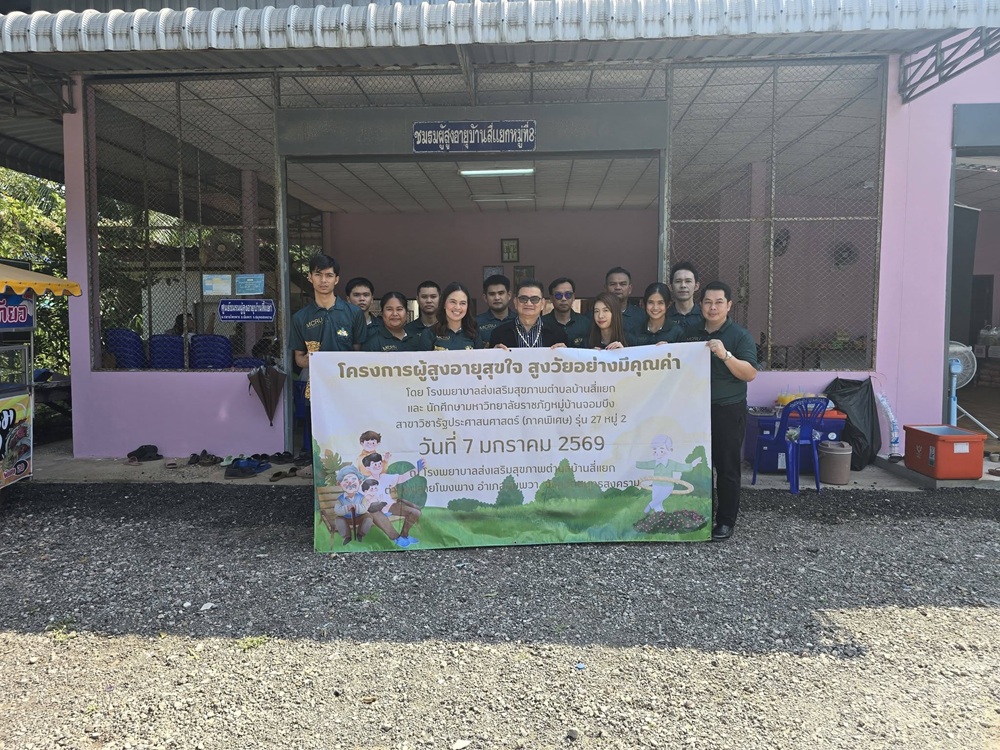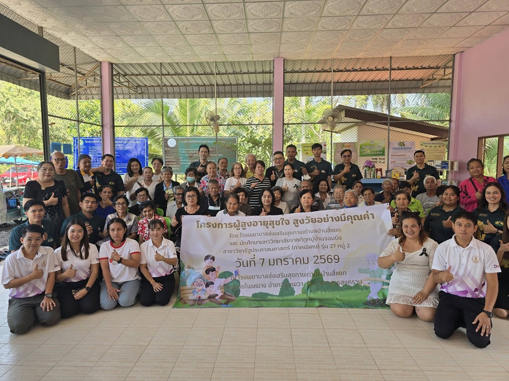 วันที่ 7 มกราคม พ.ศ. 2569นักศึกษาสาขาวิชารัฐประศาสนศาสตร์ ภาคพิเศษ รุ่นที่ 27 หมู่ 2 มหาวิทยาลัยราชภัฏหมู่บ้านจอมบึง จัดกิจกรรมเรียนรู้จากประสบการณ์จริง ผ่านโครงการ “ผู้สูงอายุสุขใจ สูงวัยอย่างมีคุณค่า” ณ โรงพยาบาลส่งเสริมสุขภาพตำบลบ้านสี่แยก ตำบลปลายโพงพาง อำเภออัมพวา จังหวัดสมุทรสงคราม
