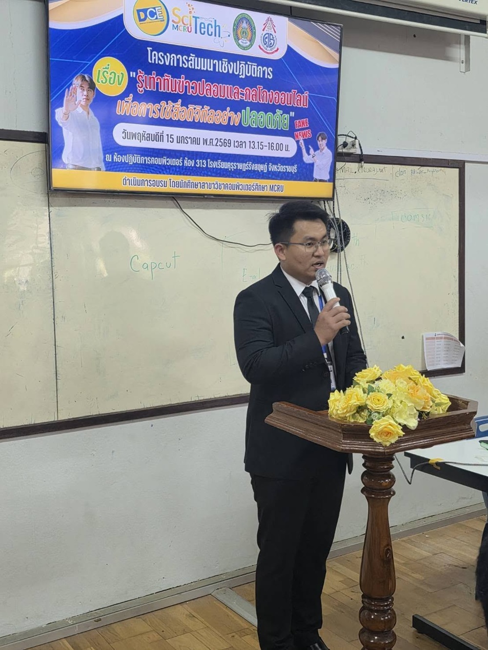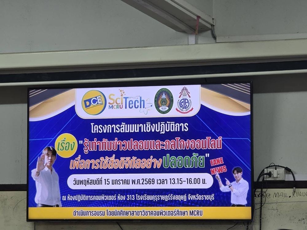 วันที่ 15 มกราคม 2569 นักศึกษาชั้นปีที่ 4 สาขาวิชาคอมพิวเตอร์ศึกษา คณะวิทยาศาสตร์และเทคโนโลยี มหาวิทยาลัยราชภัฏหมู่บ้านจอมบึง จัดโครงการสัมมนาเชิงปฏิบัติการ เรื่อง “รู้เท่าทันข่าวปลอมและกลโกงออนไลน์เพื่อการใช้สื่อดิจิทัลอย่างปลอดภัย” ให้แก่นักเรียนระดับชั้นมัธยมศึกษาปีที่ 6/3 ณ โรงเรียนคุรุราษฎร์รังสฤษฏ์ จังหวัดราชบุรี