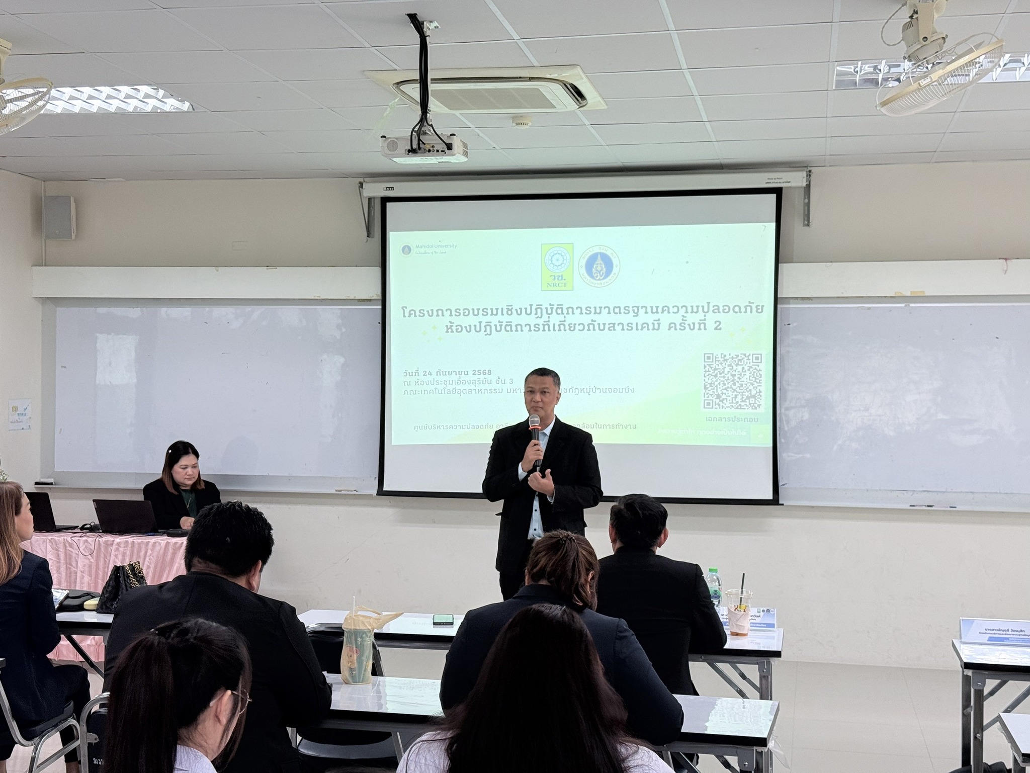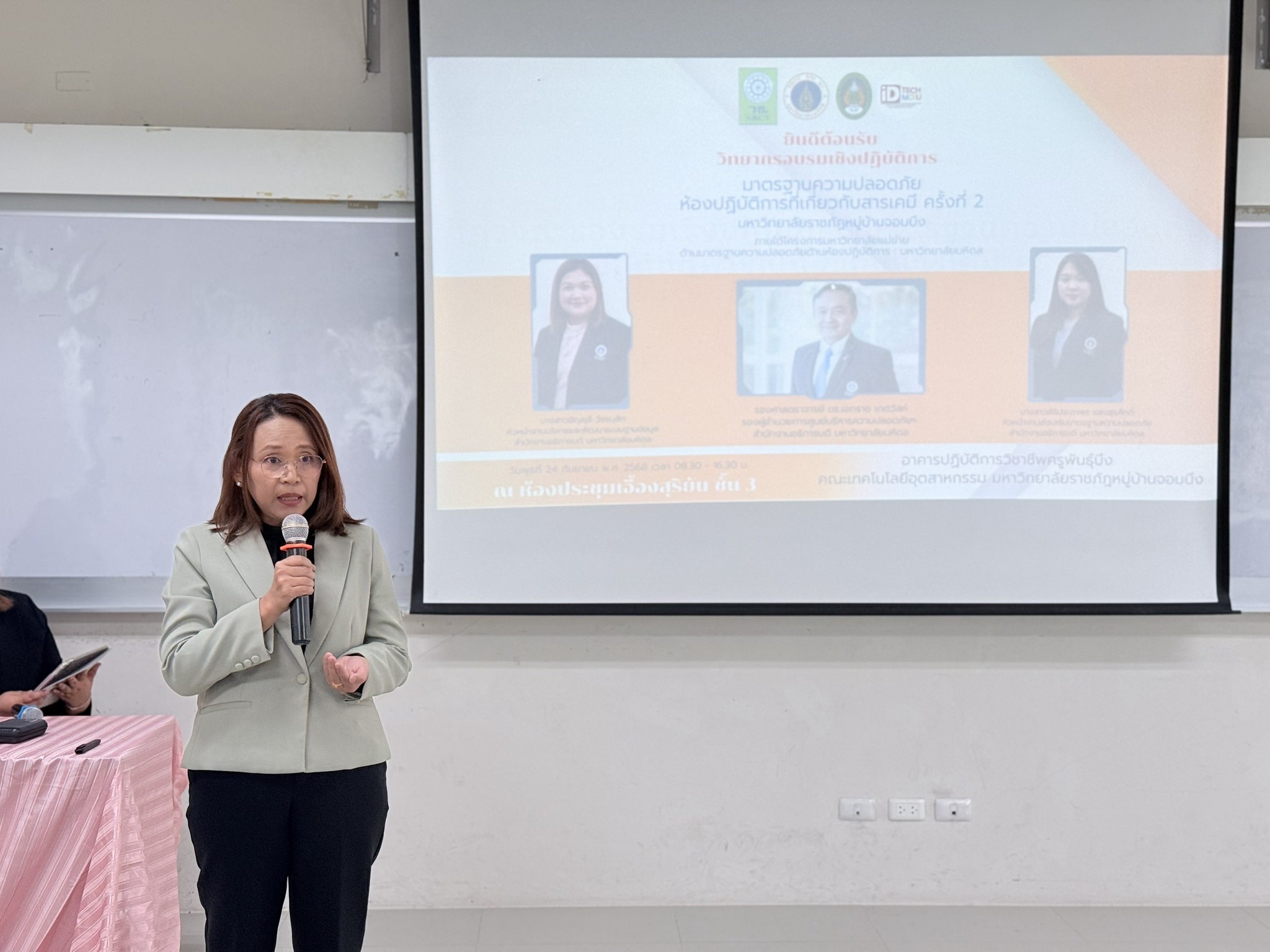 วันที่ 24 กันยายน 2568 สำนักงานการวิจัยแห่งชาติ ร่วมกับมหาวิทยาลัยมหิดล และมหาวิทยาลัยราชภัฏหมู่บ้านจอมบึง จัดโครงการอบรมเชิงปฏิบัติการมาตรฐานความปลอดภัยห้องปฏิบัติการที่เกี่ยวข้องกับสารเคมี ครั้งที่ 2 ณ ห้องประชุมเอื้องสุริยัน ชั้น 3 มหาวิทยาลัยราชภัฏหมู่บ้านจอมบึง