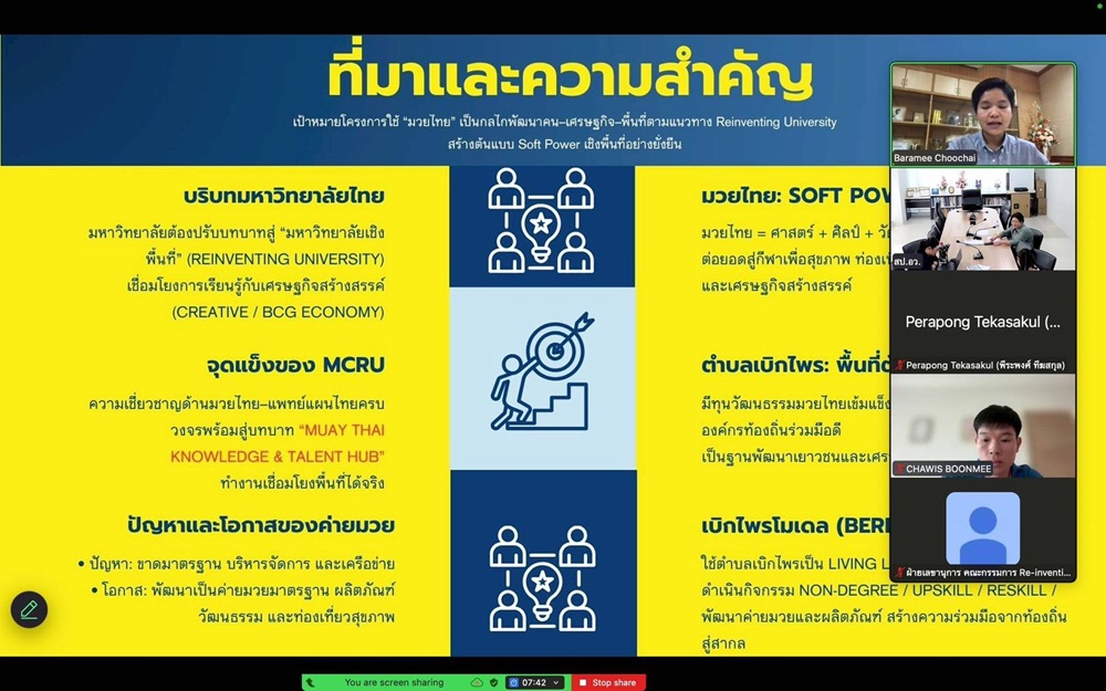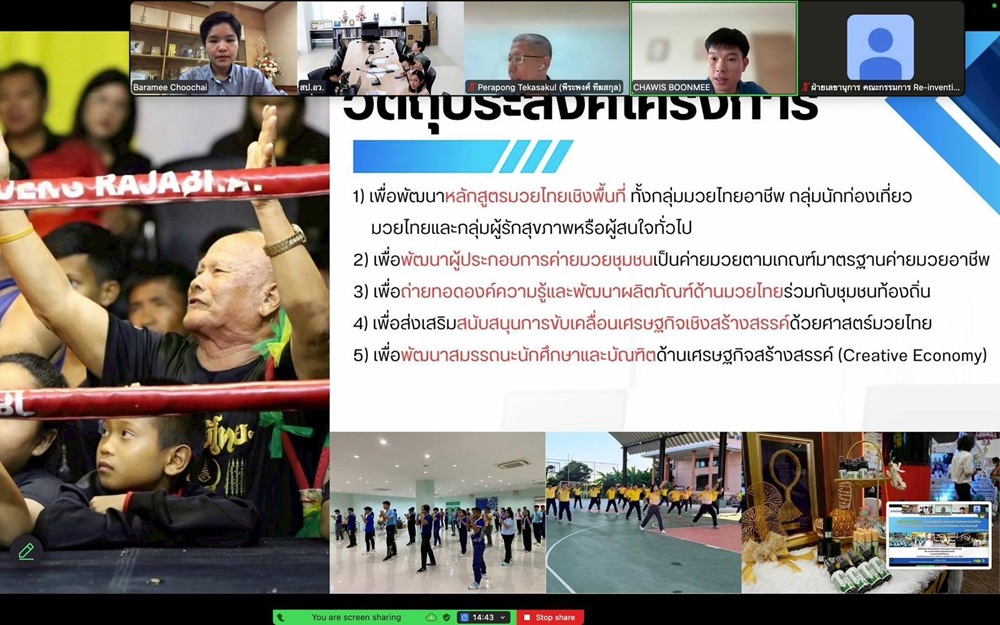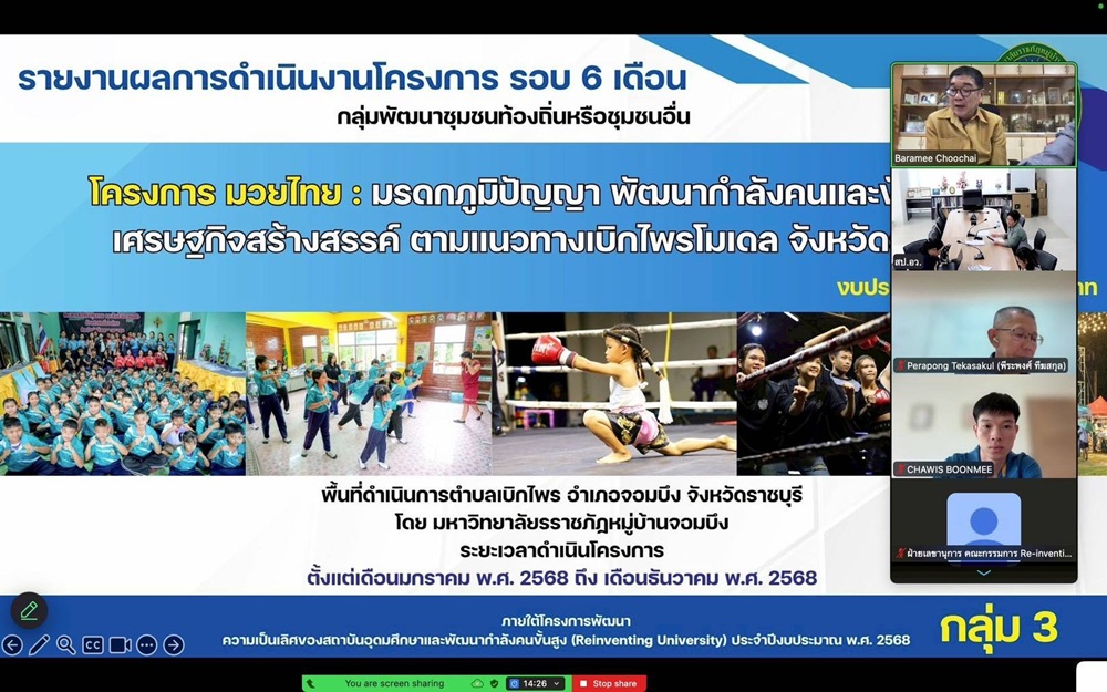 โดยมี ผู้ช่วยศาสตราจารย์อรรถพล อุสายพันธ์ รักษาราชการแทนอธิการบดีมหาวิทยาลัยราชภัฏหมู่บ้านจอมบึง และ อาจารย์ ดร.บารมี ชูชัย คณบดีวิทยาลัยมวยไทยศึกษาและการแพทย์แผนไทย เป็นผู้แทนนำเสนอผลการดำเนินงานโครงการ “มวยไทย: มรดกภูมิปัญญา พัฒนากำลังคนและขับเคลื่อนเศรษฐกิจสร้างสรรค์ ตามแนวทางเบิกไพรโมเดล จังหวัดราชบุรี”