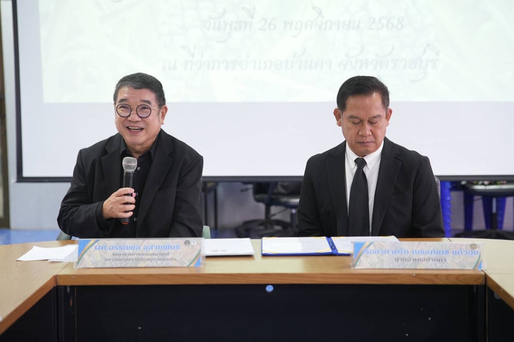 วันที่ 26 พฤศจิกายน 2568 ผู้ช่วยศาสตราจารย์อรรถพล อุสายพันธ์ รักษาราชการแทนอธิการบดีมหาวิทยาลัยราชภัฏหมู่บ้านจอมบึง เป็นประธานพิธี ลงนามบันทึกข้อตกลงความร่วมมือทางวิชาการ (MOU) เพื่อเสริมสร้างความเข้มแข็งของ ชุมชนสับปะรดต้นแบบอำเภอบ้านคา จังหวัดราชบุรี ณ ห้องประชุมที่ว่าการอำเภอบ้านคา
