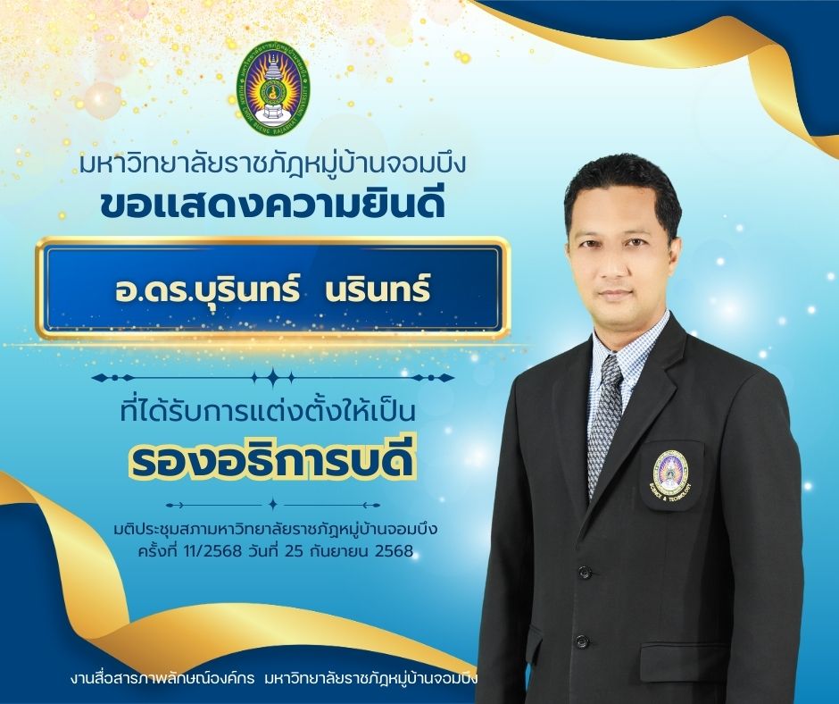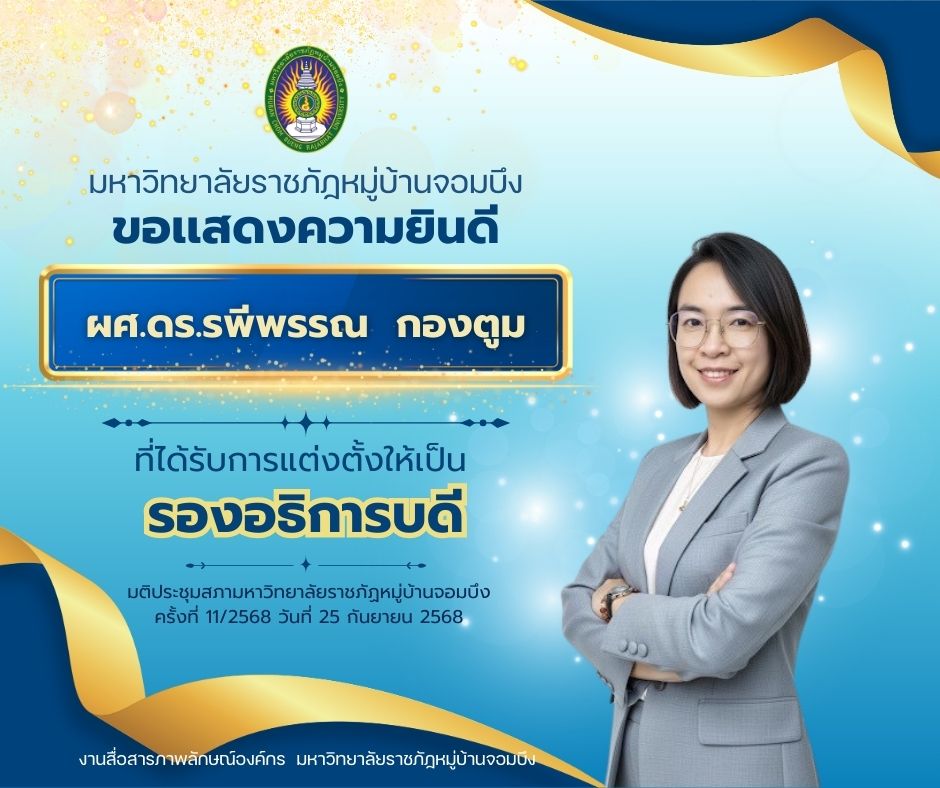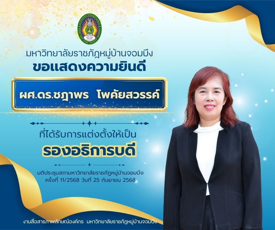 มหาวิทยาลัยราชภัฏหมู่บ้านจอมบึง ขอแสดงความยินดีแก่ผู้ได้รับการแต่งตั้งให้ดำรงตำแหน่งรองอธิการบดี ในการประชุมสภามหาวิทยาลัย ครั้งที่ 11/2568
