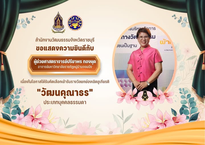 มหาวิทยาลัยราชภัฏหมู่บ้านจอมบึงขอเเสดงความยินดีกับ ผู้ช่วยศาสตราจารย์ปรียาพร ทองผุด อาจารย์ประจำสาขาวิชาศิลปศึกษา คณะมนุษยศาสตร์และสังคมศาสตร์ มหาวิทยาลัยราชภัฏหมู่บ้านจอมบึง เนื่องในโอกาสได้รับคัดเลือกเข้ารับรางวัลยกย่องเชิดชูเกียรติ "วัฒนคุณาธร" ประจำปีงบประมาณ พ.ศ. ๒๕๖๘ "ประเภทบุคคลธรรมดา" ซึ่งเป็นรางวัลอันทรงเกียรติจากกระทรวงวัฒนธรรม มอบให้แก่ผู้ที่มีผลงานโดดเด่นในการส่งเสริม สนับสนุน และทำนุบำรุงศิลปวัฒนธรรมของชาติ