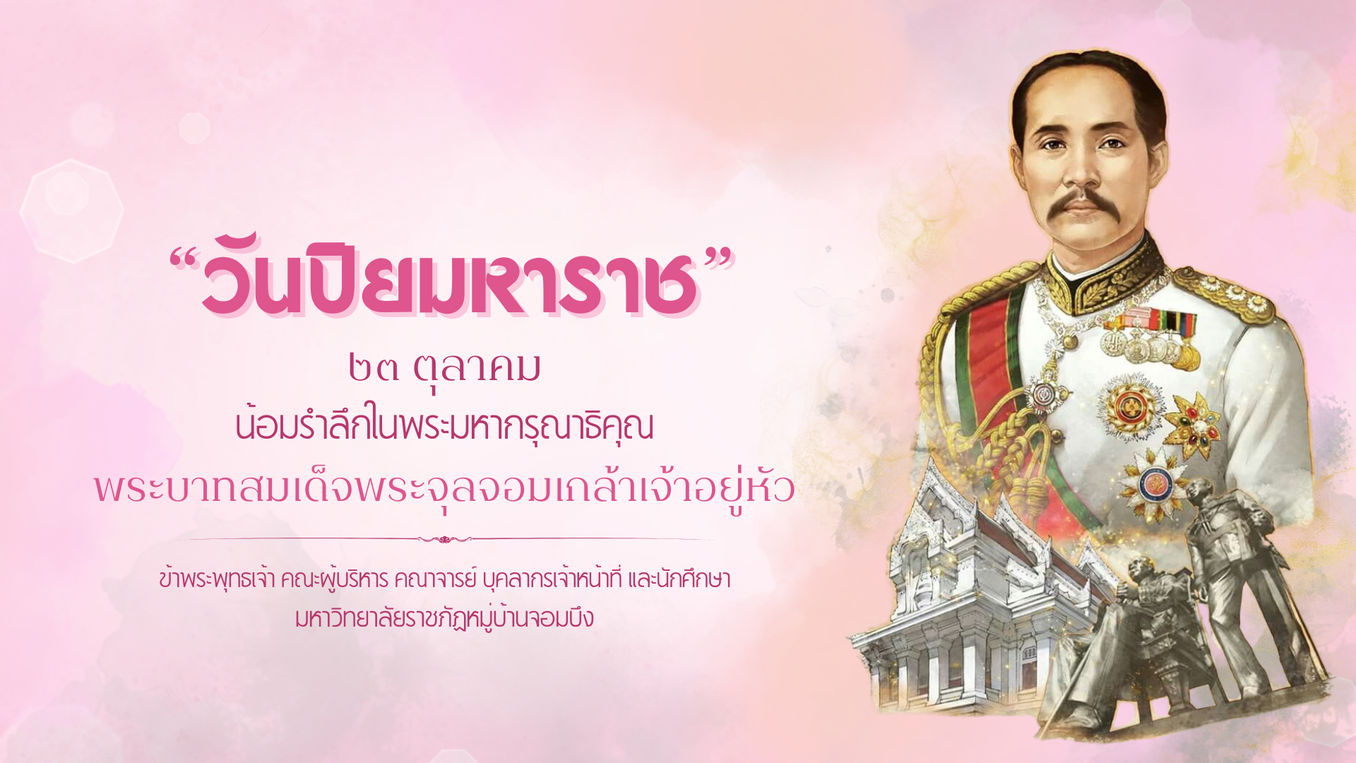 23 ตุลาคม วันปิยมหาราช ร่วมน้อมรำลึกในพระมหากรุณาธิคุณของพระบาทสมเด็จพระจุลจอมเกล้าเจ้าอยู่หัว รัชกาลที่ 5 ข้าพระพุทธเจ้า คณะผู้บริหาร คณาจารย์ บุคลากรเจ้าหน้าที่ และนักศึกษา มหาวิทยาลัยราชภัฏหมู่บ้านจอมบึง