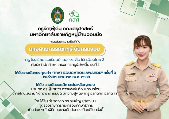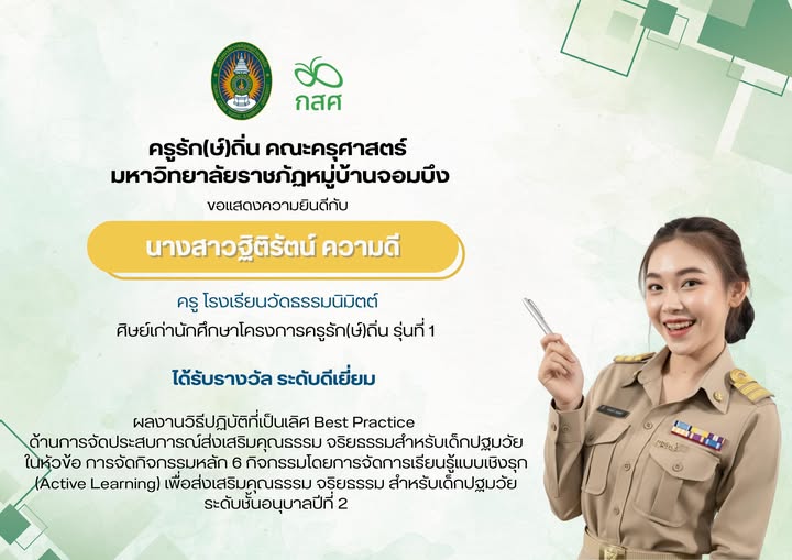 มหาวิทยาลัยราชภัฏหมู่บ้านจอมบึง ขอแสดงความยินดีกับศิษย์เก่าครูรัก(ษ์)ถิ่น ที่มุ่งมั่นสร้างคุณภาพการศึกษาและแรงบันดาลใจให้กับเยาวชนไทย