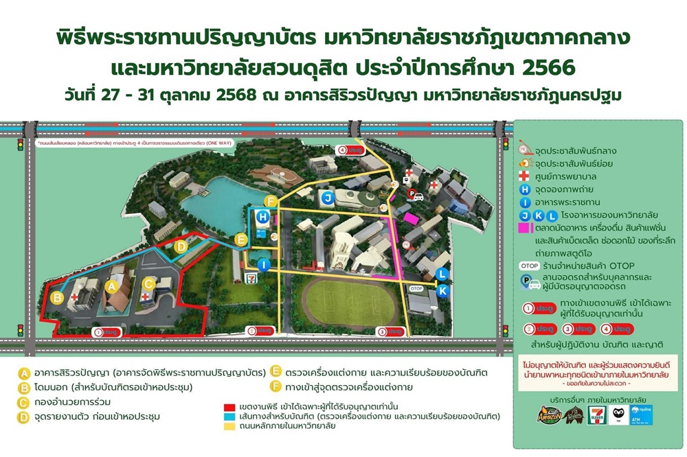 มหาวิทยาลัยราชภัฏหมู่บ้านจอมบึง ขอประชาสัมพันธ์ แผนผังภายในงานพิธีพระราชทานปริญญาบัตร มหาวิทยาลัยราชภัฏเขตภาคกลาง และมหาวิทยาลัยสวนดุสิต ประจำปีการศึกษา 2566 เพื่ออำนวยความสะดวกแก่บัณฑิต ผู้ปกครอง และผู้ร่วมงานทุกท่าน