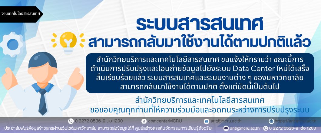 งานเทคโนโลยีสารสนเทศ สำนักวิทยบริการและเทคโนโลยีสารสนเทศ ขอแจ้งให้ทราบว่า ขณะนี้การดำเนินการปรับปรุงและโอนถ่ายข้อมูลไปยังระบบ Data Center ใหม่ได้เสร็จสิ้นเรียบร้อยแล้ว ระบบสารสนเทศและระบบงานต่าง ๆ ของมหาวิทยาลัย สามารถกลับมาใช้งานได้ตามปกติ ตั้งแต่บัดนี้เป็นต้นไป