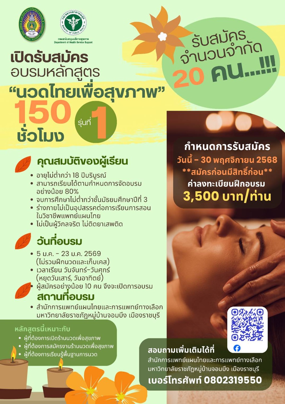 📞 สอบถามเพิ่มเติม: สำนักการแพทย์แผนไทยและการแพทย์ทางเลือก มหาวิทยาลัยราชภัฏหมู่บ้านจอมบึง โทร. 080-2319550