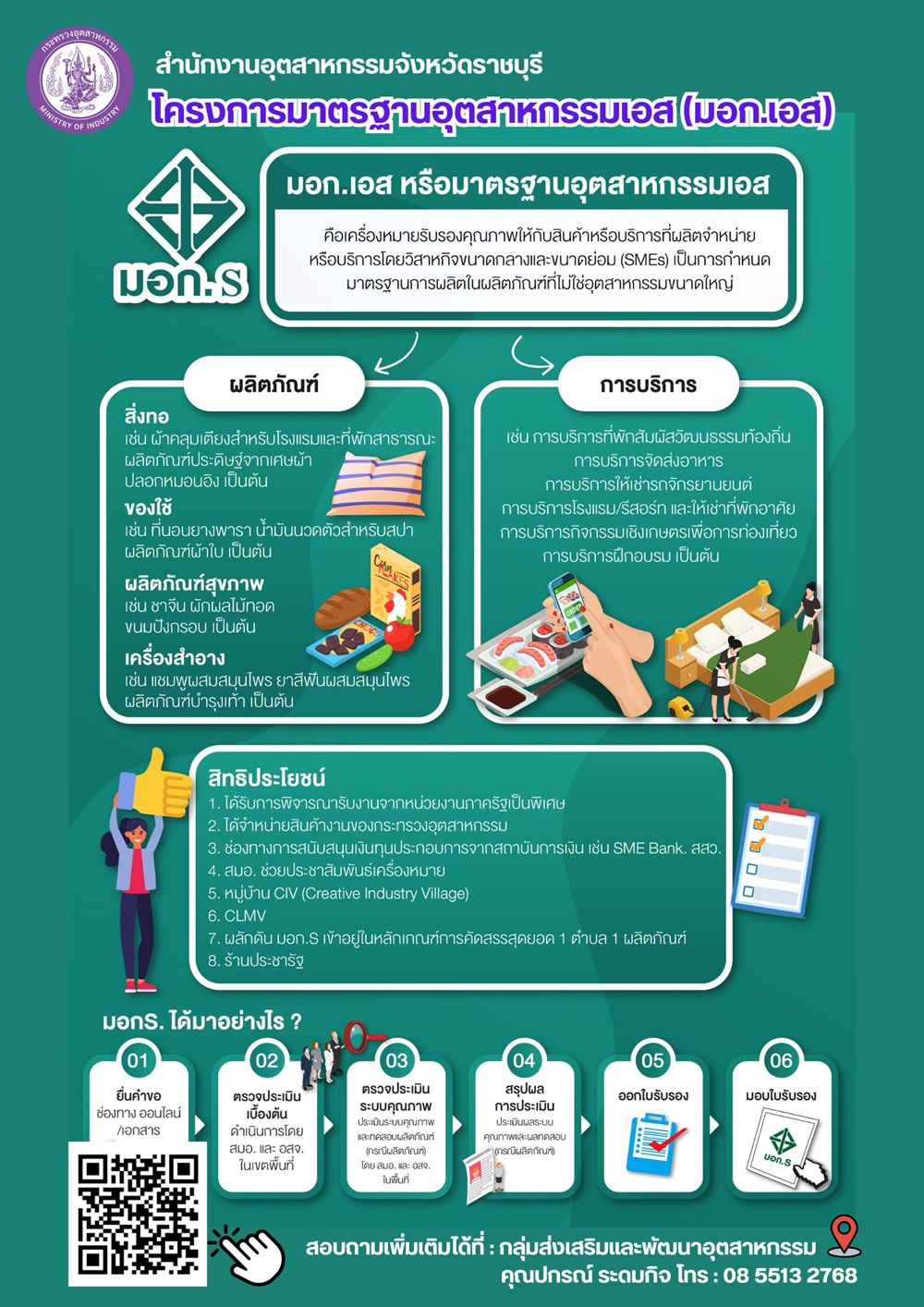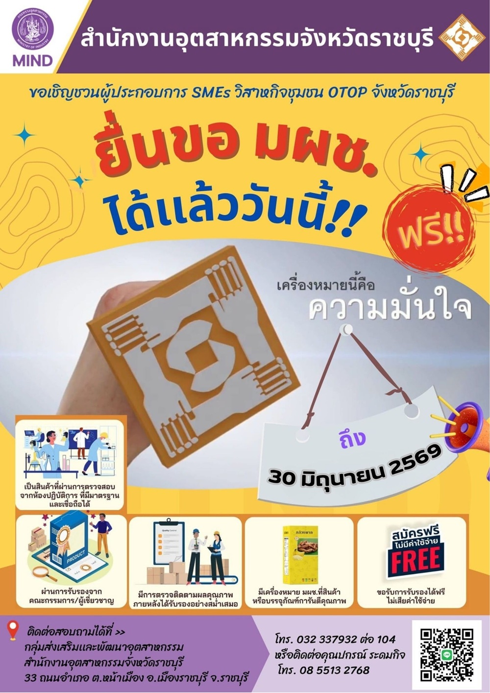 กลุ่มส่งเสริมและพัฒนาอุตสาหกรรม สำนักงานอุตสาหกรรมจังหวัดราชบุรี ขอสำรวจความต้องการผู้ประกอบการและผู้สนใจทุกท่าน ร่วมกรอก “แบบสำรวจความต้องการในการยื่นคำขอใบรับรองมาตรฐานอุตสาหกรรมเอส (มอก.เอส) ของ กลุ่มส่งเสริมและพัฒนาอุตสาหกรรม สำนักงานอุตสาหกรรมจังหวัดราชบุรี ประจำปีงบประมาณ พ.ศ. 2569” เพื่อหากลุ่มเป้าหมายที่ต้องการยื่นคำขอใบรับรองมาตรฐานอุตสาหกรรมเอส (มอก.เอส) ผลิตภัณฑ์และบริการ