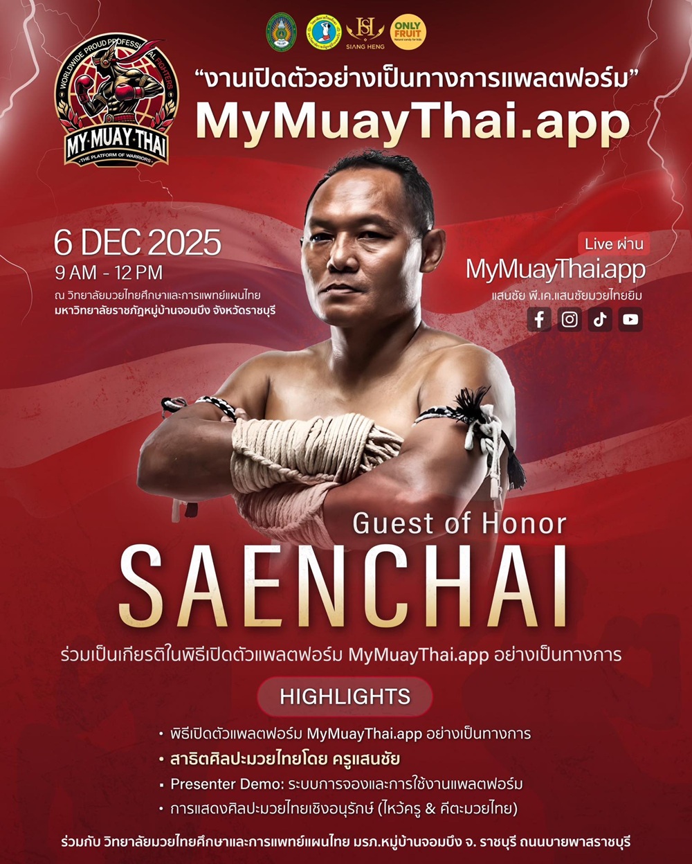 ขอเชิญชวนทุกท่านร่วมงาน เปิดตัวแพลตฟอร์ม “MyMuayThai.app” นวัตกรรมดิจิทัลเพื่อวงการมวยไทยที่จะสร้างเครือข่ายครบวงจรให้กับทุกภาคส่วนในแวดวงมวยไทย ไม่ว่าจะเป็น ครูมวย เทรนเนอร์ ค่ายมวย นักเรียน ทีมแสดง ผู้จัดงาน โรงแรม ไปจนถึง Job Board สำหรับงานสอน งานโปรโมท และงานโชว์ โดยร่วมมือกับวิทยาลัยมวยไทยศึกษาและการแพทย์แผนไทย มหาวิทยาลัยราชภัฏหมู่บ้านจอมบึง