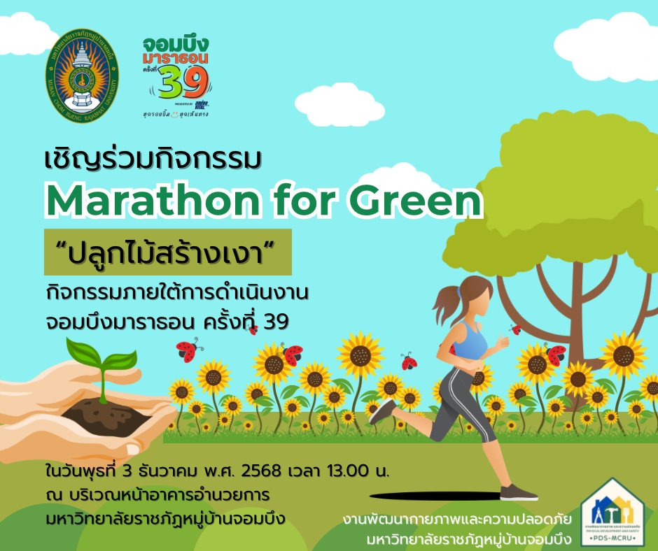 งานพัฒนากายภาพและความปลอดภัยขอเชิญชวนคณาจารย์ บุคลากร นักศึกษา และประชาชนทุกท่าน ร่วมกิจกรรม “Marathon for Green : ปลูกไม้สร้างเงา” ภายใต้การดำเนินงานของงาน จอมบึงมาราธอน 2569