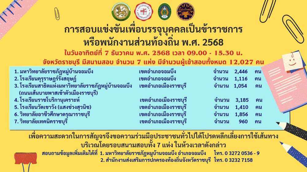 ประชาสัมพันธ์แจ้งหลีกเลี่ยงเส้นทางรอบสนามสอบคัดเลือกบุคคลเป็นข้าราชการส่วนท้องถิ่น จังหวัดราชบุรี วันที่ 7 ธันวาคม 2568