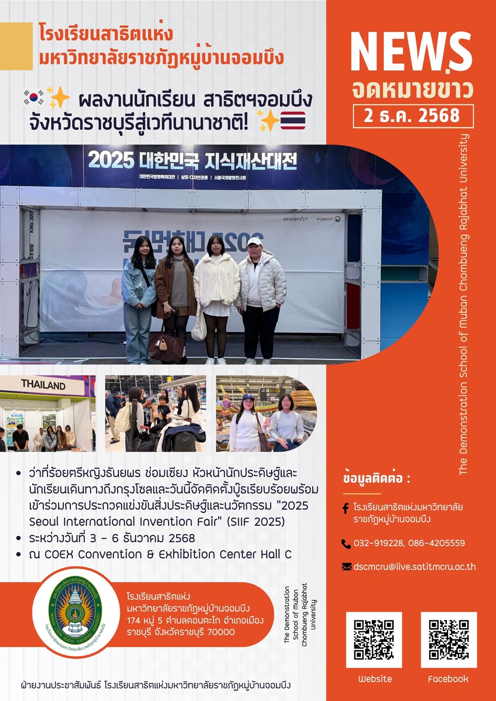 ผลงานของนักเรียนโรงเรียนสาธิตมหาวิทยาลัยราชภัฏหมู่บ้านจอมบึง จังหวัดราชบุรี สร้างความภาคภูมิใจอีกครั้ง เมื่อ ว่าที่ร้อยตรีหญิง ธันยพร ช่อมเซียง หัวหน้านักประดิษฐ์ พร้อมทีมนักเรียน ได้เดินทางถึงกรุงโซล ประเทศเกาหลีใต้ เพื่อเข้าร่วมการประกวดแข่งขันสิ่งประดิษฐ์และนวัตกรรมระดับนานาชาติ “2025 Seoul International Invention Fair” (SIIF 2025) ซึ่งจัดขึ้นระหว่างวันที่ 3 – 6 ธันวาคม 2568 ณ COEX Convention & Exhibition Center Hall C