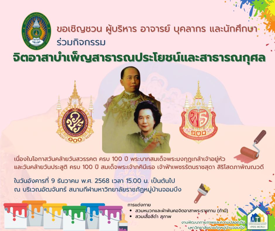 งานพัฒนากายภาพและความปลอดภัย สำนักงานอธิการบดี มหาวิทยาลัยราชภัฏหมู่บ้านจอมบึง ขอเชิญ ผู้บริหาร อาจารย์ บุคลากร และนักศึกษา ทุกท่าน เข้าร่วมกิจกรรม จิตอาสาบำเพ็ญสาธารณประโยชน์และสาธารณกุศล เพื่อถวายเป็นพระราชกุศล เนื่องในโอกาสสำคัญ ได้แก่ วันคล้ายวันสวรรคตครบ 100 ปี พระบาทสมเด็จพระมงกุฎเกล้าเจ้าอยู่หัว และ วันคล้ายวันประสูติครบ 100 ปี สมเด็จพระเจ้าภคินีเธอ เจ้าฟ้าเพชรรัตนราชสุดา สิริโสภาพัณณวดี