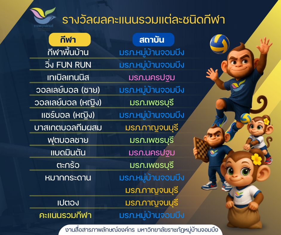 มหาวิทยาลัยราชภัฏหมู่บ้านจอมบึง ขอประกาศ ผลคะแนนรวมแต่ละชนิดกีฬา จากการแข่งขัน กีฬาบุคลากร พ.จ.น.ก. สัมพันธ์ ครั้งที่ 46 “ราชพฤกษ์เกมส์” ซึ่งจัดขึ้นระหว่างวันที่ 18–19 ธันวาคม 2568 ณ มหาวิทยาลัยราชภัฏหมู่บ้านจอมบึง