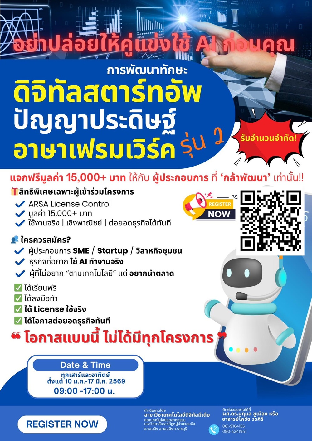 คณะเทคโนโลยีอุตสาหกรรมขอเชิญเข้าร่วมโครงการอบรม “การพัฒนาทักษะดิจิทัลสตาร์ทอัพด้วย AI อาษาเฟรมเวิร์ค รุ่นที่ 2” เรียนฟรี พร้อมลงมือทำจริง