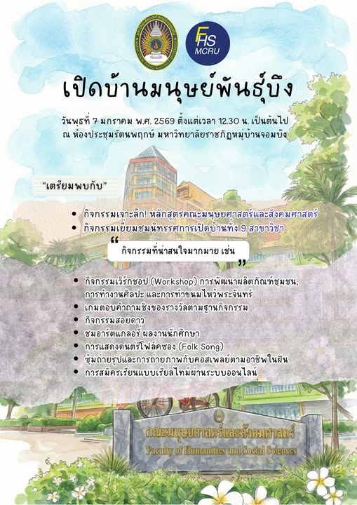 คณะมนุษยศาสตร์และสังคมศาสตร์ มหาวิทยาลัยราชภัฏหมู่บ้านจอมบึง ขอเชิญนักเรียน นักศึกษา และผู้สนใจเข้าร่วม โครงการ “เปิดบ้านมนุษย์พันธุ์บึง” (Open House) ประจำปี 2569 เพื่อเปิดประสบการณ์การเรียนรู้ ทำความรู้จักหลักสูตร การเรียนการสอน และบรรยากาศการใช้ชีวิตในรั้วมหาวิทยาลัยอย่างใกล้ชิด ในวันพุธที่ 7 มกราคม 2569 ตั้งแต่เวลา 12.30 น. เป็นต้นไป ณ ห้องประชุมรัตนพฤกษ์ มหาวิทยาลัยราชภัฏหมู่บ้านจอมบึง
