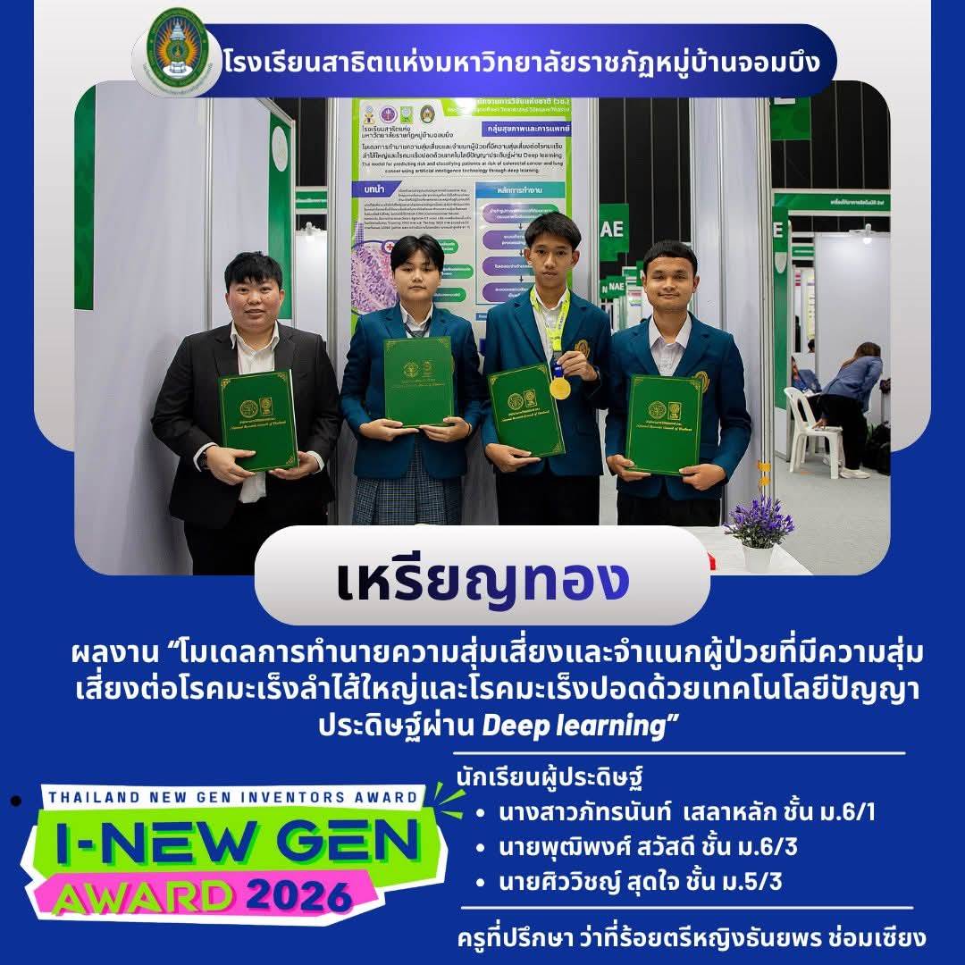 มหาวิทยาลัยราชภัฏหมู่บ้านจอมบึง ขอแสดงความยินดีกับนักเรียนโรงเรียนสาธิตแห่งมหาวิทยาลัยราชภัฏหมู่บ้านจอมบึง ที่ได้รับ รางวัลเหรียญทอง จากการประกวดโครงการสิ่งประดิษฐ์และนวัตกรรมระดับเยาวชน Thailand New Gen Inventors Award 2026 (I – New Gen Award 2026) รอบตัดสิน ระดับมัธยมศึกษา ซึ่งจัดขึ้นระหว่างวันที่ 5 – 9 มกราคม 2569 ณ Event Hall 100 – 101 ศูนย์นิทรรศการและการประชุมไบเทค บางนา กรุงเทพมหานคร
