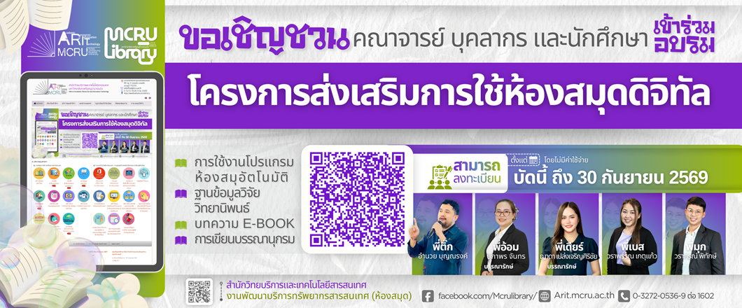 สำนักวิทยบริการและเทคโนโลยีสารสนเทศ มหาวิทยาลัยราชภัฏหมู่บ้านจอมบึง ขอเชิญอาจารย์ นักศึกษา และบุคลากร เข้าร่วมอบรม “โครงการส่งเสริมการใช้ห้องสมุดดิจิทัล” เพื่อเสริมสร้างความรู้ ความเข้าใจ และทักษะการใช้งานห้องสมุดดิจิทัลอย่างมีประสิทธิภาพ โดยได้รับเกียรติจาก ทีมวิทยากรผู้มากประสบการณ์ด้าน Digital Library มาร่วมถ่ายทอดเทคนิคการสืบค้นข้อมูลเชิงลึก การเข้าถึงทรัพยากรสารสนเทศ และการประยุกต์ใช้ข้อมูลเพื่อการเรียน การสอน การทำวิจัย และการพัฒนางานวิชาการ
