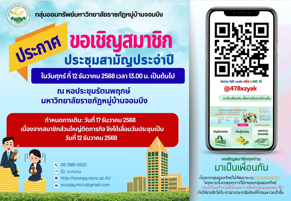 กลุ่มออมทรัพย์มหาวิทยาลัยราชภัฏหมู่บ้านจอมบึง เชิญสมาชิกเข้าร่วมประชุมสามัญประจำปี 2568