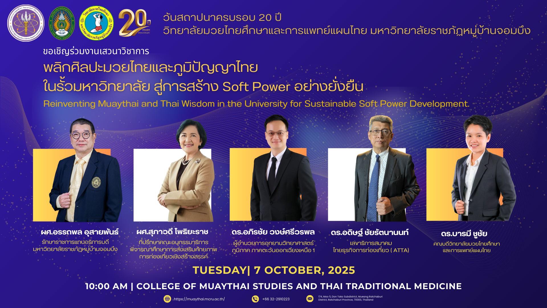 วิทยาลัยมวยไทยศึกษาและการแพทย์แผนไทย ขอเชิญร่วมวันสถาปนาครบรอบ 20 ปี การก่อตั้งวิทยาลัยมวยไทยศึกษาและการแพทย์แผนไทย ภายใต้แนวคิด“สถาบันแห่งเดียวของไทยที่ยกระดับมวยไทย และบูรณาการวิถีสุขภาพไทยสู่ระบบอุดมศึกษา”