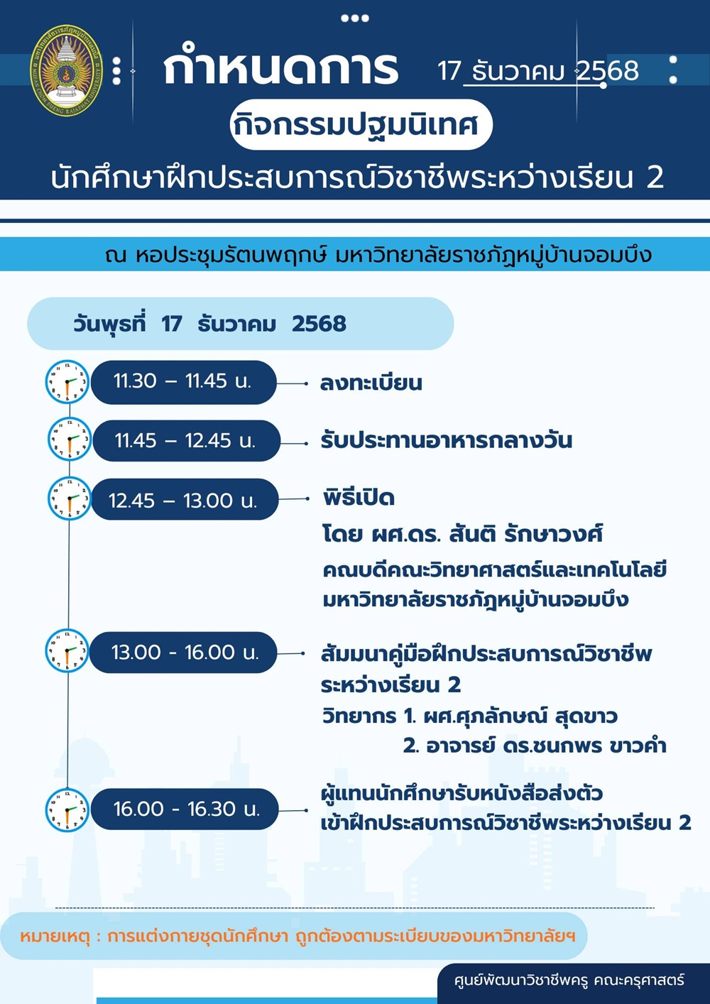 1. กิจกรรมปฐมนิเทศนักศึกษาฝึกประสบการณ์ฯ วันอังคารที่ 17 ธันวาคม 2568 ณ หอประชุมรัตนพฤกษ์ มหาวิทยาลัยราชภัฏหมู่บ้านจอมบึง นักศึกษาทุกคนต้องเข้าร่วมเพื่อรับฟังแนวทาง ขั้นตอน และข้อปฏิบัติก่อนออกฝึกสอนในสถานศึกษา