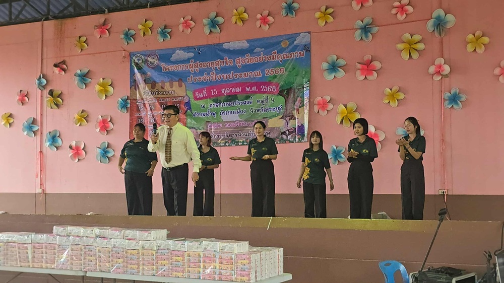 วันที่ 15 ตุลาคม 2568 อาจารย์บำเพ็ญ รอดรัศมี อาจารย์พิเศษสาขาวิชารัฐประศาสนศาสตร์ คณะมนุษยศาสตร์และสังคมศาสตร์ มหาวิทยาลัยราชภัฏหมู่บ้านจอมบึง ผู้สอนรายวิชา การปกครองท้องถิ่นไทย ได้นำนักศึกษาหลักสูตรรัฐประศาสนศาสตรบัณฑิต (ภาคพิเศษ) รุ่นที่ 27 หมู่ 1 ลงพื้นที่จัดกิจกรรม “ผู้สูงอายุสุขใจ สูงวัยยังมีคุณภาพ” ณ ศาลาเอนกประสงค์ หมู่ 4 ตำบลน้ำพุ อำเภอเมือง จังหวัดราชบุรี