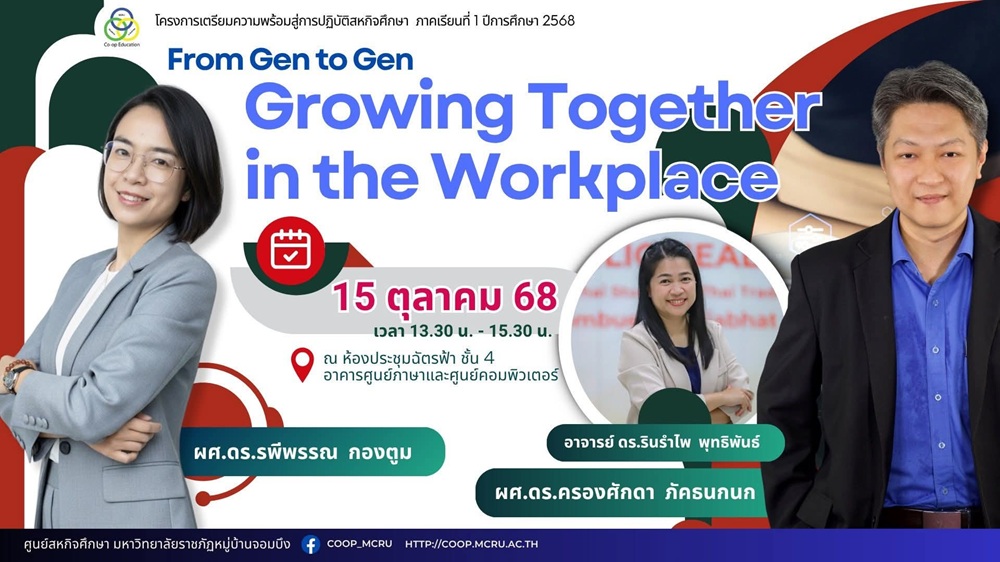 ศูนย์สหกิจศึกษา มหาวิทยาลัยราชภัฏหมู่บ้านจอมบึง จัดอบรมเตรียมสหกิจศึกษา 1/2568 เสริมทักษะ “From Gen to Gen Growing Together in the Workplace” เตรียมพร้อมสู่โลกการทำงานจริง