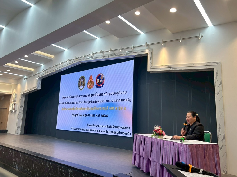 วันพุธที่ 26 พฤศจิกายน 2568 ผู้ช่วยศาสตราจารย์ ยุพยงค์ วิงวร คณบดีคณะมนุษยศาสตร์และสังคมศาสตร์ มหาวิทยาลัยราชภัฏหมู่บ้านจอมบึง เป็นประธานในพิธีเปิดโครงการ “พัฒนาทักษะภาษาอังกฤษเพื่อยกระดับชุมชนสู่สังคม” (กิจกรรมพัฒนาสมรรถนะภาษาอังกฤษสำหรับผู้บริหารและบุคลากรภาครัฐ) ณ ห้องประชุมสุพจน์ มิเถาวัลย์ ชั้น 2 อาคารอำนวยการ มหาวิทยาลัยราชภัฏหมู่บ้านจอมบึง