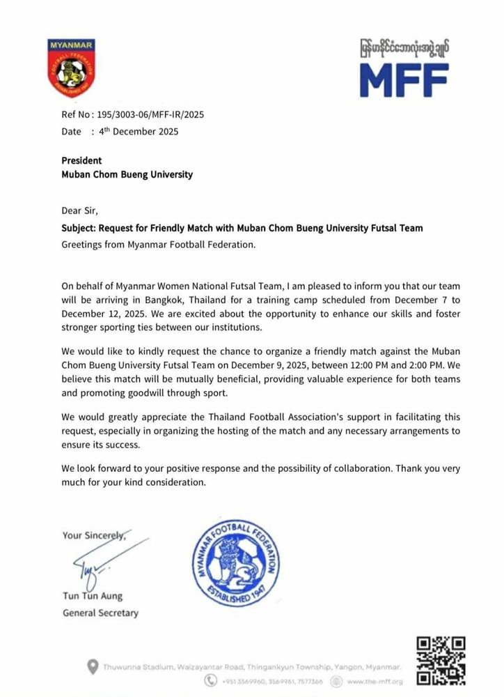 “Good Experience” ทีมฟุตซอล มรภ.หมู่บ้านจอมบึง ร่วมอุ่นเครื่องกับสมาคมกีฬาฟุตบอลเมียนมาร์ เตรียมความพร้อมสู่ซีเกมส์ ครั้งที่ 33