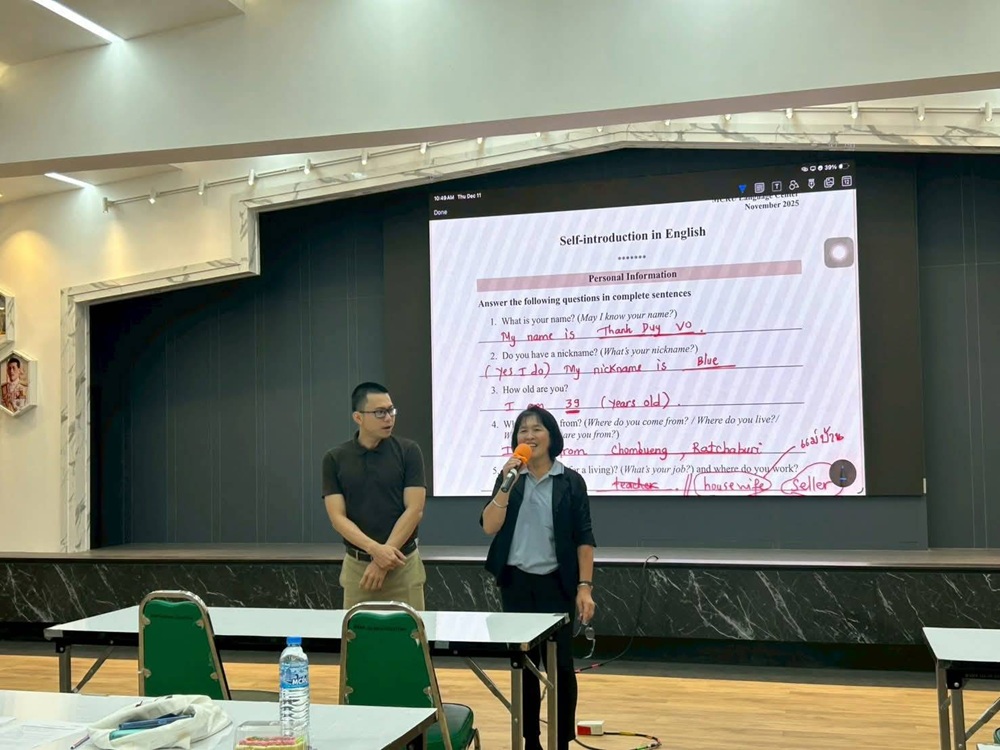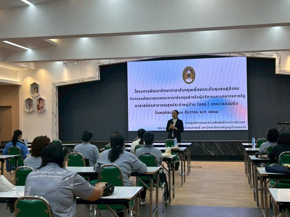 วันที่ 11 ธันวาคม 2568 ศูนย์ภาษาและความสัมพันธ์ระหว่างประเทศ มหาวิทยาลัยราชภัฏหมู่บ้านจอมบึง ดำเนินโครงการ “พัฒนาทักษะภาษาอังกฤษเพื่อยกระดับชุมชนสู่สังคม” (กิจกรรมพัฒนาสมรรถนะภาษาอังกฤษสำหรับผู้บริหารและบุคลากรภาครัฐ) ณ ห้องประชุมสุพจน์ มิเถาวัลย์ ชั้น 2 อาคารอำนวยการ
