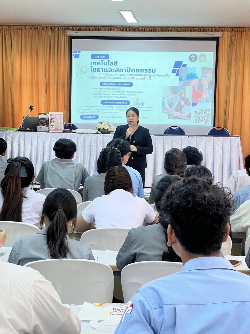 วันที่ 17 ธันวาคม 2568 ผู้ช่วยศาสตราจารย์ อรนุช จินดาสกุลยนต์ คณบดีคณะเทคโนโลยีอุตสาหกรรม มหาวิทยาลัยราชภัฏหมู่บ้านจอมบึง พร้อมด้วยรองคณบดี คณาจารย์ และเจ้าหน้าที่ ร่วมจัดกิจกรรม แนะแนวและประชาสัมพันธ์หลักสูตรการศึกษา ให้แก่นักเรียนระดับ ประกาศนียบัตรวิชาชีพ (ปวช.) และ ประกาศนียบัตรวิชาชีพชั้นสูง (ปวส.) เพื่อสร้างความเข้าใจเกี่ยวกับแนวทางการศึกษาต่อ การพัฒนาทักษะวิชาชีพ และโอกาสทางการศึกษาในระดับอุดมศึกษา