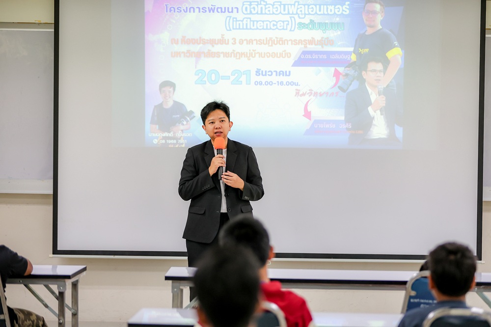 การจัดกิจกรรมครั้งนี้มุ่งเน้นการพัฒนาศักยภาพผู้เข้าร่วมให้มีทักษะด้านการสร้างสื่อดิจิทัล การสื่อสารออนไลน์ และการสร้างอัตลักษณ์อินฟลูเอนเซอร์ระดับชุมชนอย่างมืออาชีพ เพื่อส่งเสริมการประชาสัมพันธ์มวยไทยและอัตลักษณ์ชุมชนให้เป็นที่รู้จักในวงกว้าง โครงการได้รับความร่วมมือจากทีมวิทยากรผู้ทรงคุณวุฒิ ได้แก่ อาจารย์ ดร.จิรากร เฉลิมดิฐ รองคณบดีคณะเทคโนโลยีอุตสาหกรรม และประธานสาขาวิชาเทคโนโลยีดิจิทัลมีเดีย และ นายไพรัช วรศิริ ผู้จัดการศูนย์บ่มเพาะวิสาหกิจ ซึ่งได้ถ่ายทอดองค์ความรู้ ประสบการณ์ และแนวทางการพัฒนาสื่อดิจิทัลเพื่อสร้างคุณค่า เพิ่มมูลค่า และต่อยอดเศรษฐกิจสร้างสรรค์ในระดับชุมชนอย่างยั่งยืน