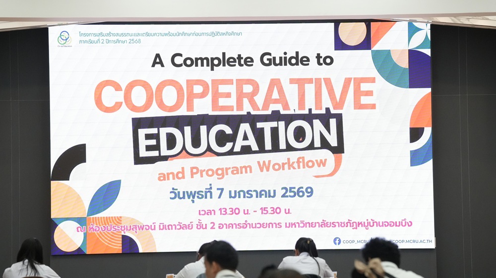 วันที่ 7 มกราคม พ.ศ. 2569 ศูนย์สหกิจศึกษา มหาวิทยาลัยราชภัฏหมู่บ้านจอมบึง จัดโครงการ เสริมสร้างสมรรถนะและเตรียมความพร้อมนักศึกษาก่อนการปฏิบัติสหกิจศึกษา สำหรับนักศึกษาภาคเรียนที่ 2 ปีการศึกษา 2568 เพื่อพัฒนาความรู้ ความเข้าใจ และทักษะที่จำเป็นก่อนเข้าสู่การปฏิบัติงานจริงในสถานประกอบการ ณ ห้องประชุมสุพจน์ มิเถาวัลย์ ชั้น 2 อาคารอำนวยการ มหาวิทยาลัยราชภัฏหมู่บ้านจอมบึง