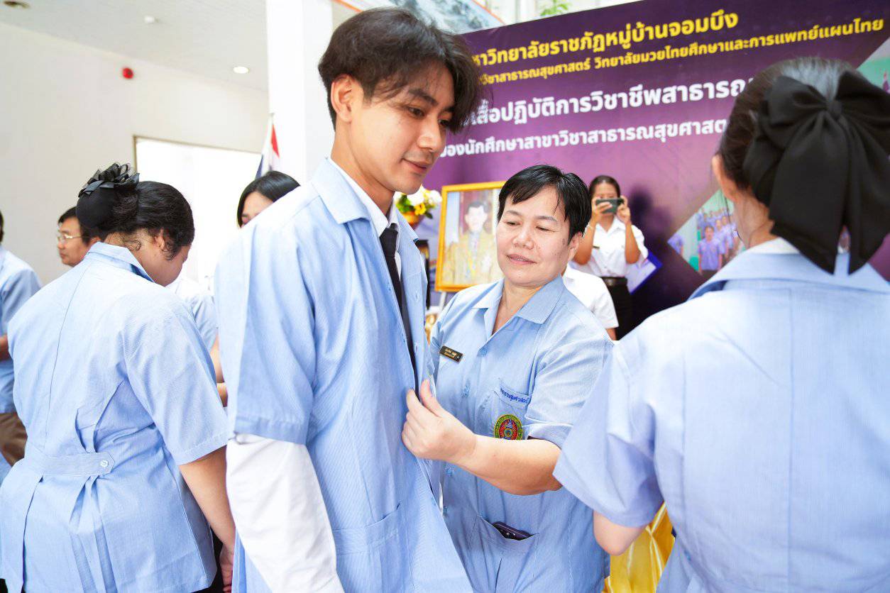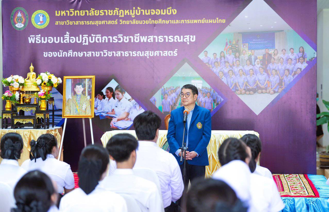 วันที่ 24 กันยายน 2568 ผศ.อรรถพล อุสายพันธ์ รักษาราชการแทนอธิการบดีเป็นประธานในพิธีมอบเสื้อปฏิบัติการวิชาชีพสาธารณสุข ประจำปี 2568 ซึ่งมีคณะผู้บริหาร และอาจารย์ของวิทยาลัยมวยไทยศึกษาและการแพทย์แผนไทย ผู้ทรงคุณวุฒิ อาจารย์ นักศึกษาประจำสาขาวิชาสาธารณสุขศาสตร์ และผู้ปกครองร่วมพิธี ณ มหาวิทยาลัยราชภัฏหมู่บ้านจอมบึง เมืองราชบุ