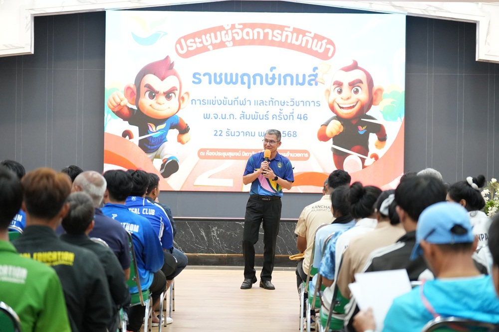 วันที่ 22 ธันวาคม 2568 ผู้ช่วยศาสตราจารย์ ดร.ชัชวาล แอร่มหล้า รองอธิการบดีมหาวิทยาลัยราชภัฏหมู่บ้านจอมบึง กล่าวต้อนรับผู้จัดการทีมและสต๊าฟโค้ชกีฬา ในการประชุมทีมจัดการแข่งขันกีฬา พ.จ.น.ก. สัมพันธ์ ครั้งที่ 46 “ราชพฤกษ์เกมส์” ณ ห้องประชุมสุพจน์ มิเถาวัลย์ ชั้น 2 อาคารอำนวยการ มหาวิทยาลัยราชภัฏหมู่บ้านจอมบึง