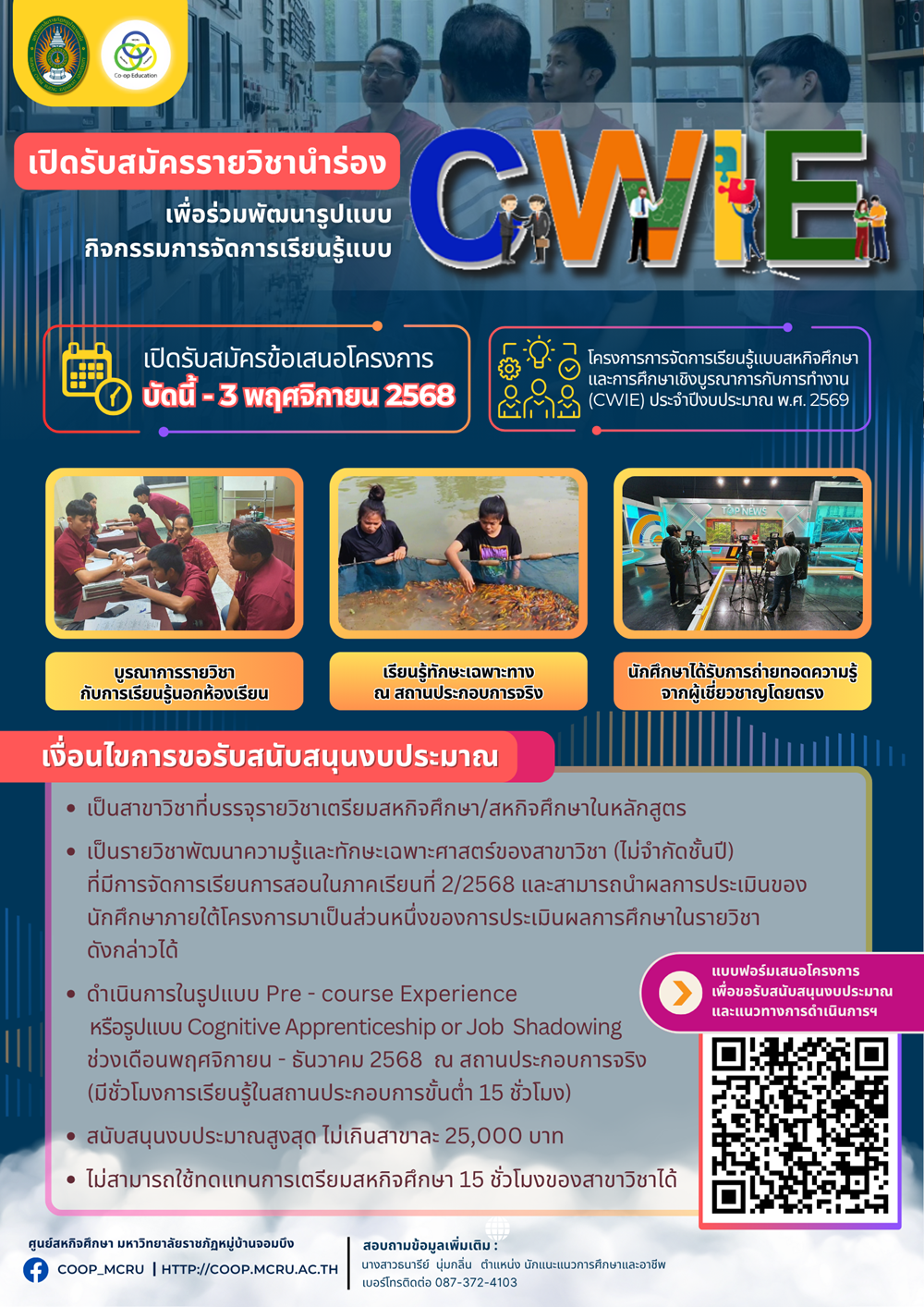 ศูนย์สหกิจศึกษา เปิดรับสมัครรายวิชานำร่อง เพื่อร่วมพัฒนารูปแบบกิจกรรมการจัดการเรียนรู้แบบ CWIE