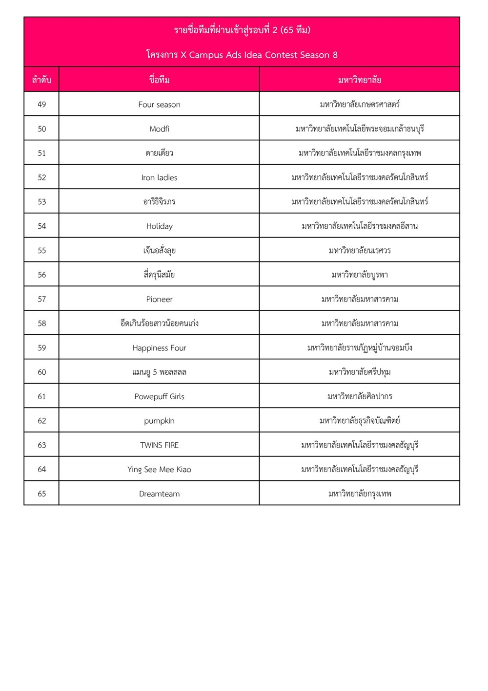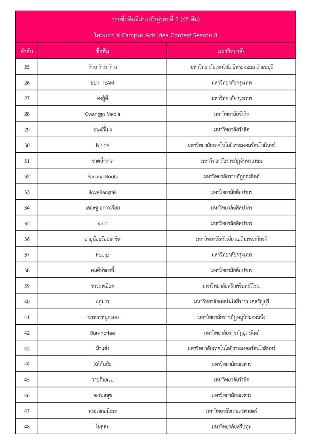 มหาวิทยาลัยราชภัฏหมู่บ้านจอมบึง ขอแสดงความยินดีกับนักศึกษาที่ผ่านเข้าสู่รอบ 2 ในโครงการ X Campus Ads Idea Contest Season 8