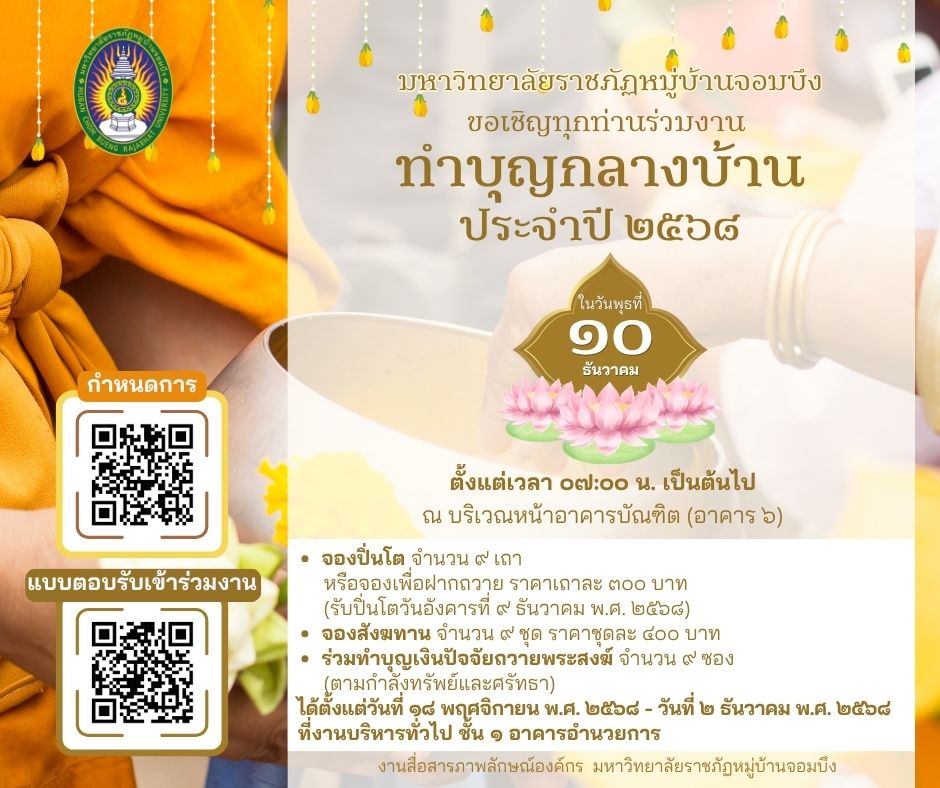 มหาวิทยาลัยราชภัฏหมู่บ้านจอมบึง ขอเชิญชวนคณาจารย์ บุคลากร นักศึกษา ศิษย์เก่า และประชาชนทั่วไป ร่วมสืบสานประเพณีอันงดงามในงาน “ทำบุญกลางบ้าน ประจำปี 2568” ในวัน พุธที่ 10 ธันวาคม 2568 ณ บริเวณหน้าอาคารบัณฑิต (อาคาร 6) เพื่อความเป็นสิริมงคลแก่ทุกคนและร่วมสร้างบุญใหญ่ให้แก่มหาวิทยาลัย