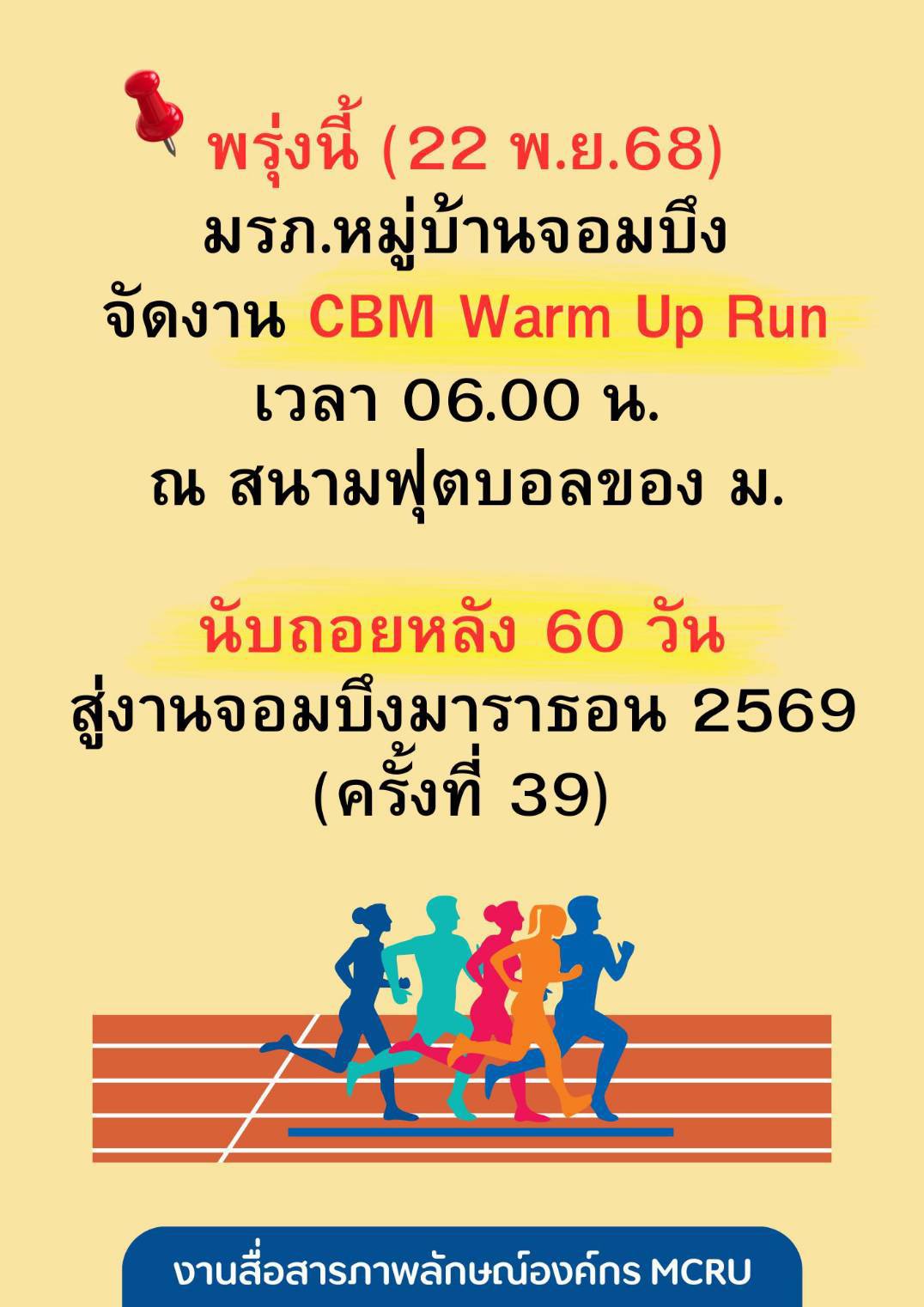 มหาวิทยาลัยราชภัฏหมู่บ้านจอมบึง ขอเชิญชวนประชาชน นักวิ่ง และชุมชนท้องถิ่นร่วมงาน CBM Warm Up Run เพื่อเป็นการอุ่นเครื่องและสร้างบรรยากาศความพร้อมก่อนงาน จอมบึงมาราธอน ครั้งที่ 39 ในโอกาสครบรอบ 60 วันสู่การแข่งขันหลัก