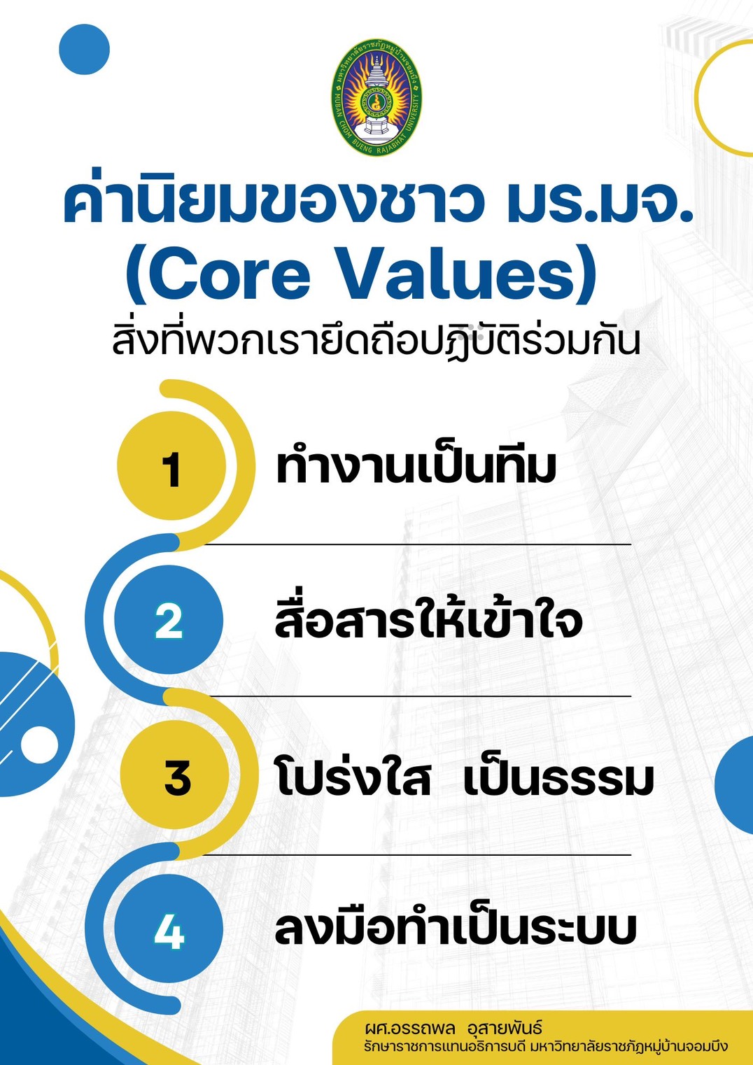 มหาวิทยาลัยราชภัฏหมู่บ้านจอมบึง โดย ผู้ช่วยศาสตราจารย์อรรถพล อุสายพันธ์ รักษาราชการแทนอธิการบดี เดินหน้าขับเคลื่อนค่านิยมองค์กร (Core Values) เพื่อเป็นแนวทางในการพัฒนาบุคลากร การบริหารจัดการ และการทำงานร่วมกันในทุกระดับของมหาวิทยาลัย โดยกำหนดค่านิยมหลัก 4 ประการ เพื่อสร้างวัฒนธรรมองค์กรที่เข้มแข็ง โปร่งใส และมีประสิทธิภาพ