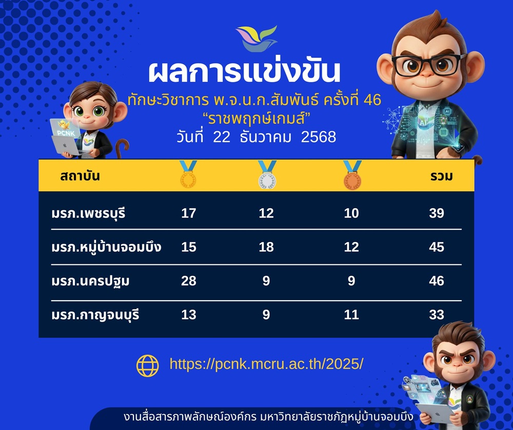 มหาวิทยาลัยราชภัฏหมู่บ้านจอมบึง ขอประชาสัมพันธ์ สรุปเหรียญการแข่งขันทักษะวิชาการ ในการแข่งขันทักษะวิชาการ พ.จ.น.ก.สัมพันธ์ ครั้งที่ 46 “ราชพฤกษ์เกมส์” ซึ่งจัดขึ้นเมื่อวันที่ 22 ธันวาคม 2568