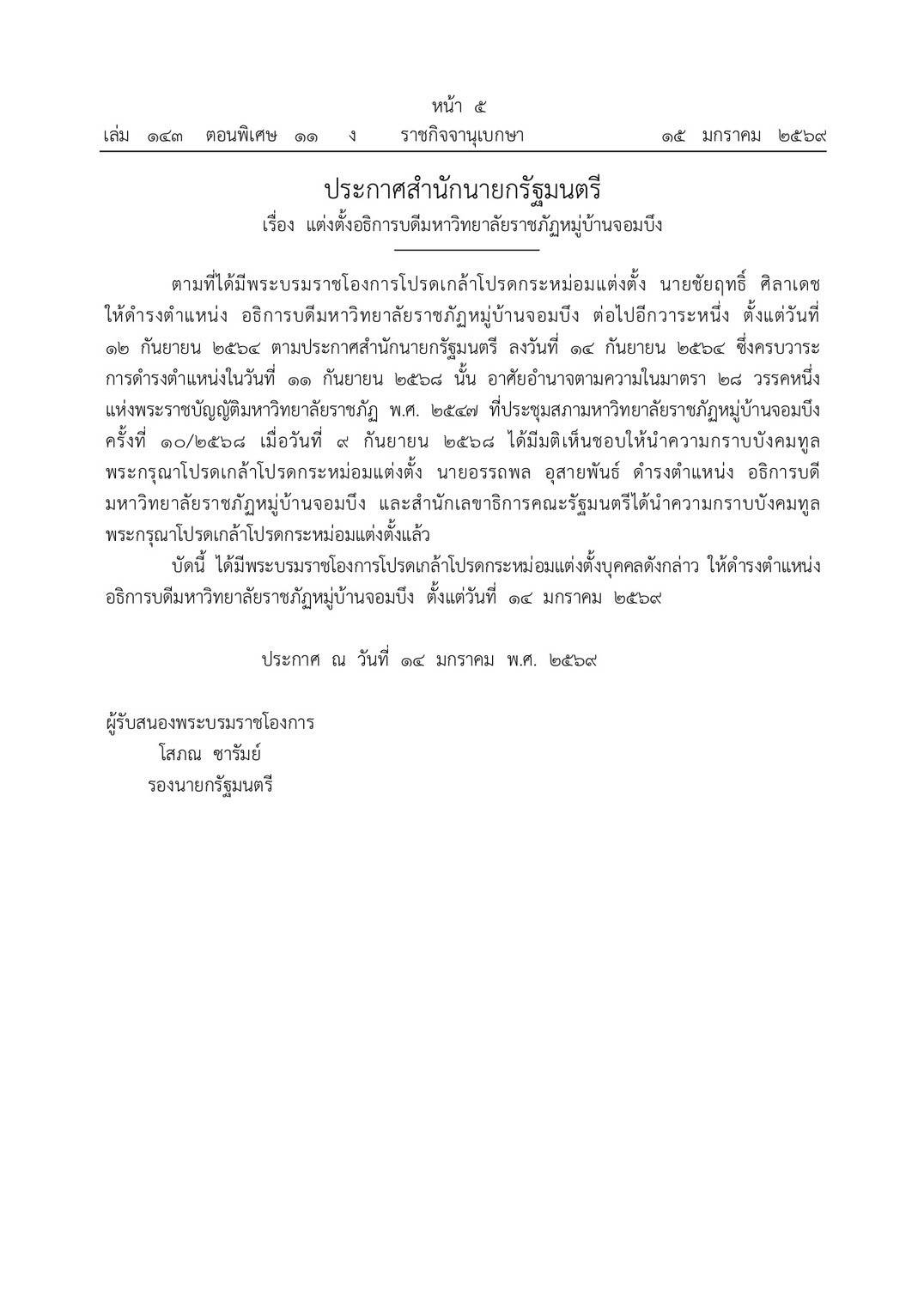 มหาวิทยาลัยราชภัฏหมู่บ้านจอมบึง ขอแสดงความยินดีอย่างยิ่งกับ ผู้ช่วยศาสตราจารย์ อรรถพล อุสายพันธ์ ในโอกาสได้รับพระบรมราชโองการโปรดเกล้าฯ แต่งตั้งให้ดำรงตำแหน่ง อธิการบดีมหาวิทยาลัยราชภัฏหมู่บ้านจอมบึง ตามประกาศสำนักนายกรัฐมนตรี เรื่อง แต่งตั้งอธิการบดีมหาวิทยาลัยราชภัฏหมู่บ้านจอมบึง ตั้งแต่วันที่ 14 มกราคม 2569 ประกาศ ณ วันที่ 14 มกราคม พ.ศ. 2569